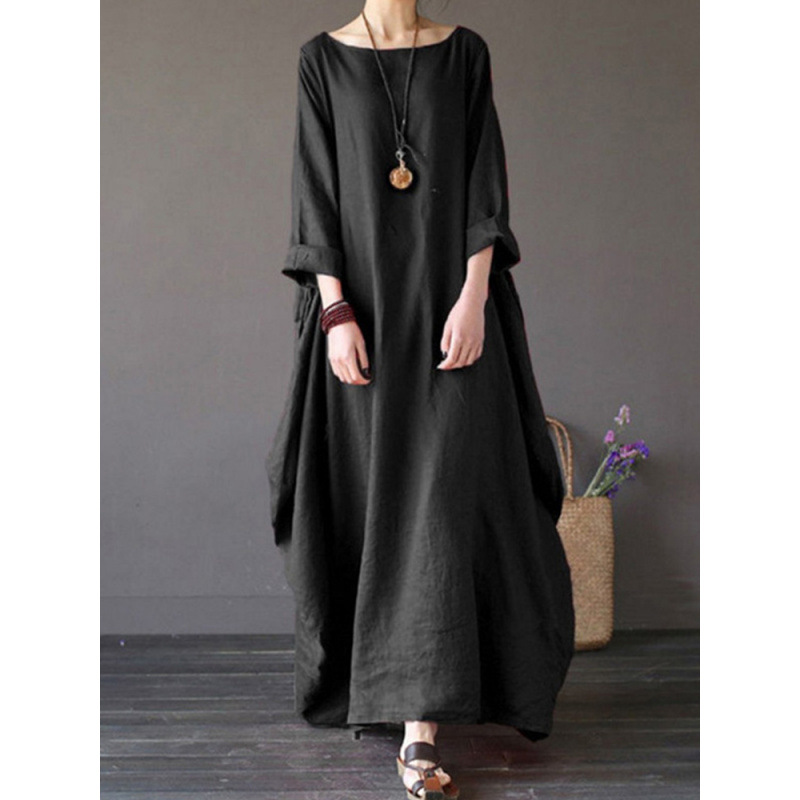 クロスボーダー速売通アマゾン秋松長袖大ぶり純色綿麻レトロ民族風ワイドワンピース