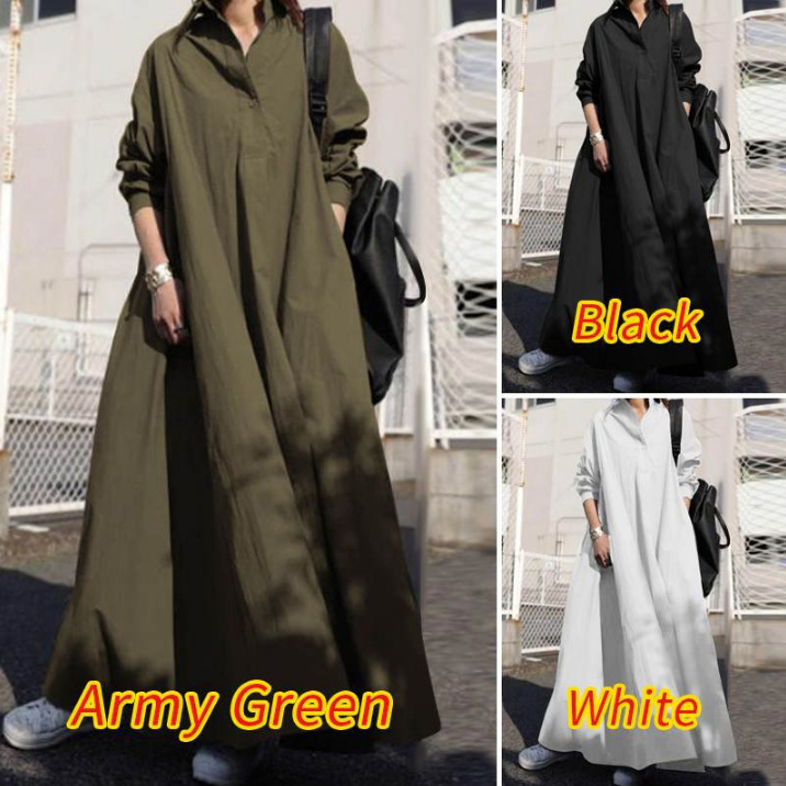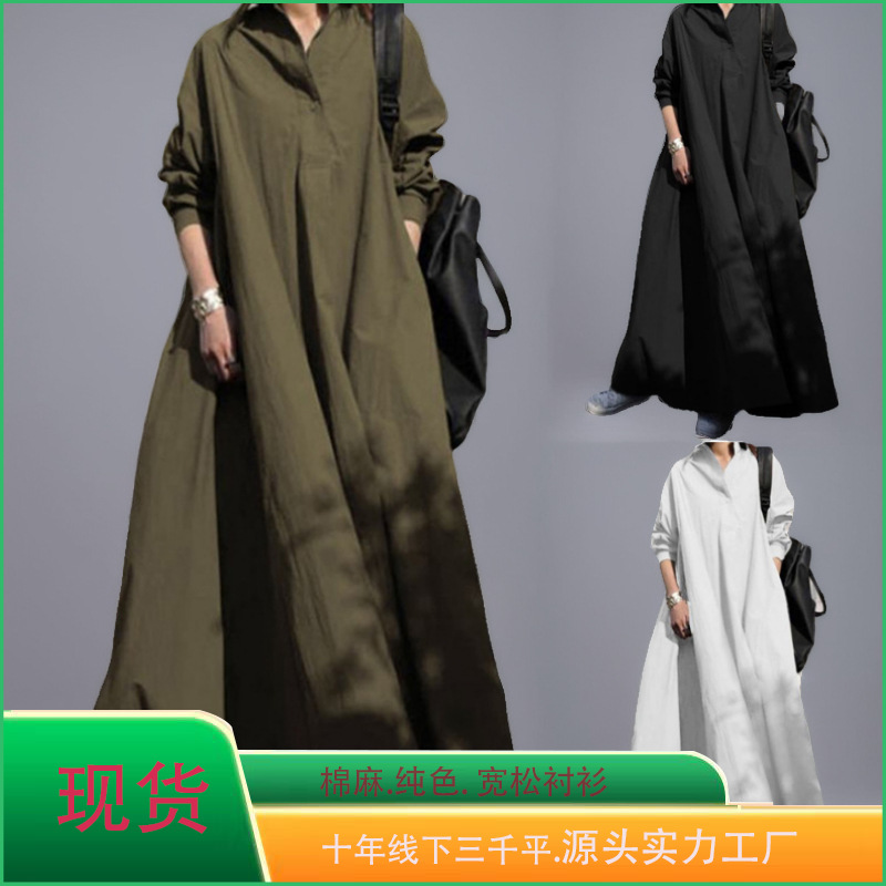 2025 アマゾン春と秋の綿とリネン無地レトロエスニックスタイルルーズラペル長袖大きいサイズの大きな裾のドレス