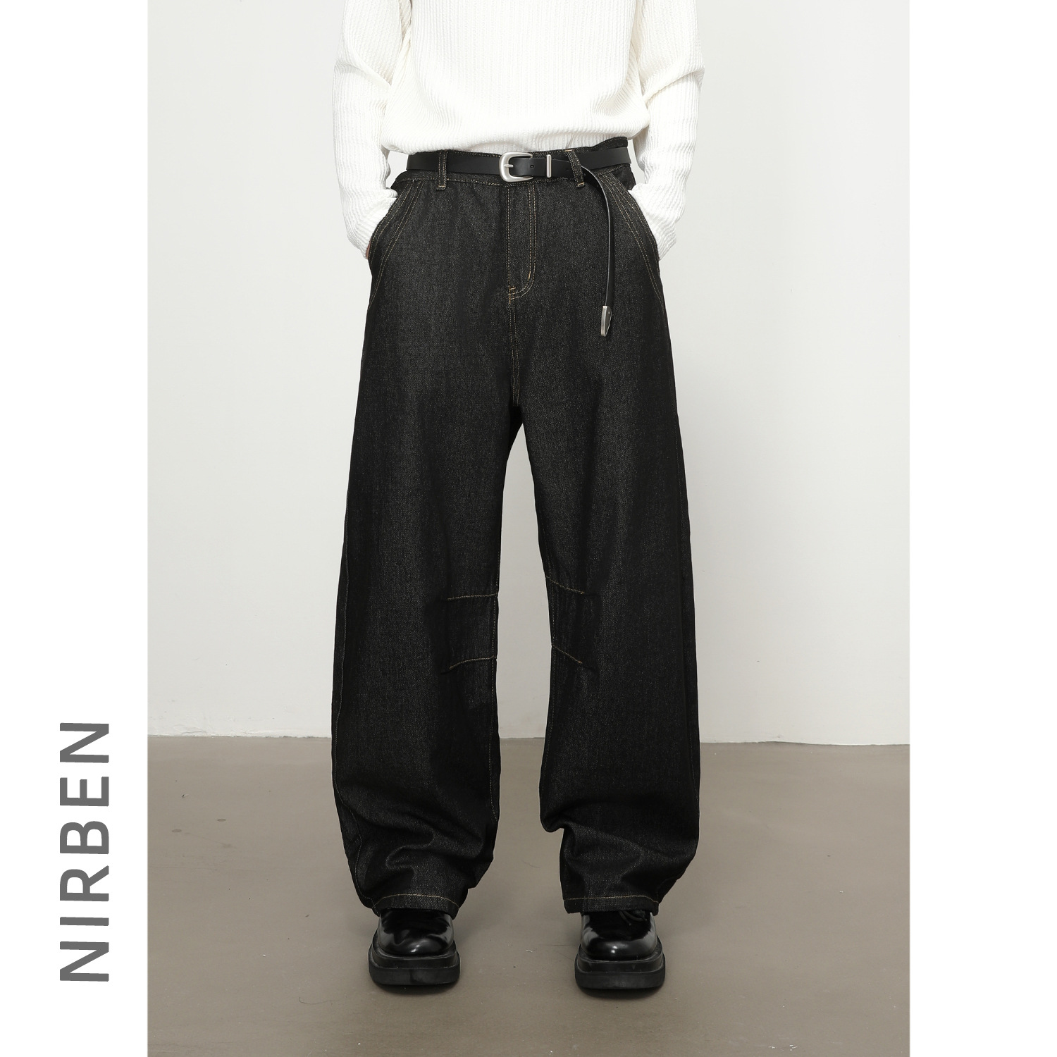 nirben牛仔|新款原色弯刀牛仔裤男潮牌设计感拼接宽松百搭阔腿裤