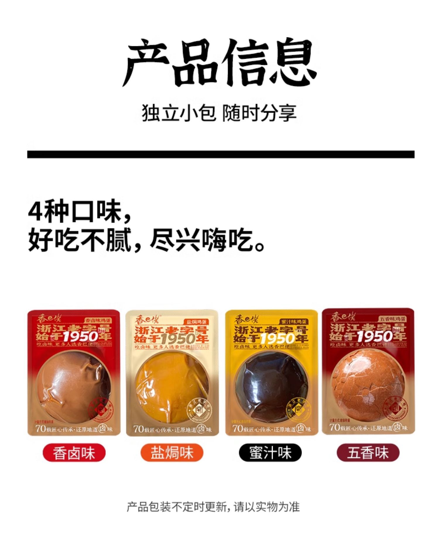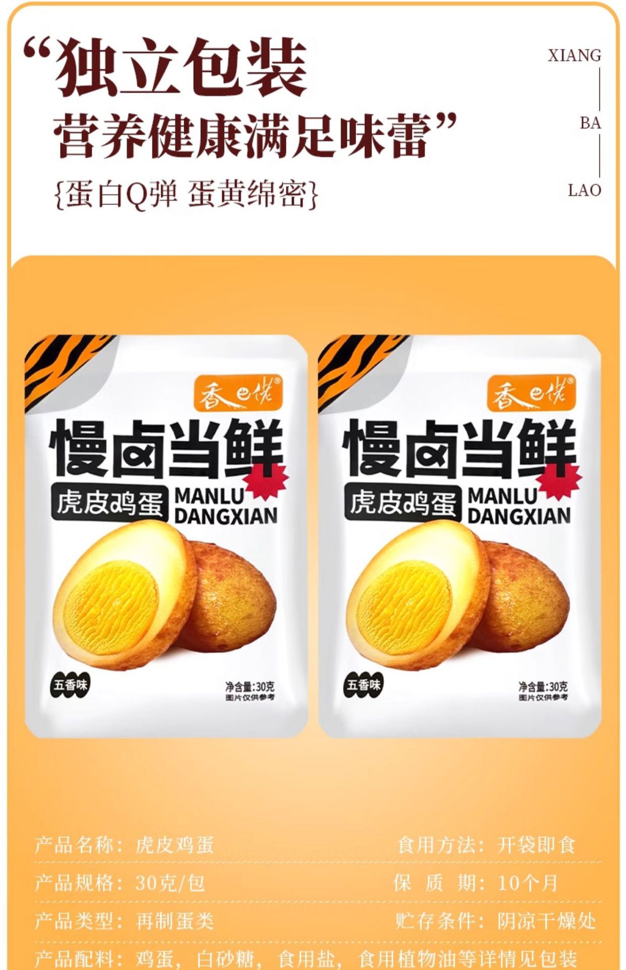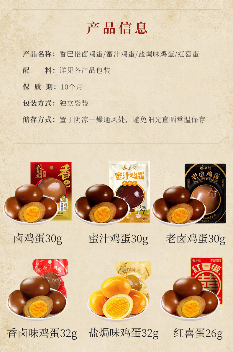 シャンバラオ【煮卵】30g(1袋),シャンバラオ【殻付き五香卵】30g(1袋),シャンバラオ【はちみつたまご】30g(1袋),シャンバラオ【虎皮卵】30g(1袋),シャンバオ 【卵の煮込み】ダブルエッグ 58g(シングル袋),シャンバオ【クリスピー】鴨手羽根 35g(1袋),シャンバオ 【辛口】鴨手羽根 35g(1袋),シャンバオ 【ダブルダブルダックウィングルートソース】 70g(1袋),ゴールデンシェフ【五香】たまご 32g(1袋),ゴールデンシェフ【オリジナルフレーバー】たまご 32g(1袋),曹老板【殻なし二個入り】五香煮卵 60g (個包装),曹老板【殻なし一粒入り】五香煮卵 30g (個包装),曹老板【殻なし2粒入り】 泡椒卵 70g (1袋),Xian Ge [ウーロン茶風味] 茶卵 30g (1袋),Xian Ge [ジャスミン風味] ティーエッグ 30g (1袋),Xian Ge [殻なし五香卵] 55g (1袋),Xian Ge [殻なし五香卵] 26g (1袋),王小卤【塩味】香る塩味煮卵 30g (個包装),王小卤【香辣味】虎皮鸡蛋25g(单袋) **Translation:** 王小卤【香辣味】虎皮卵 25g (個包装),王小卤【香辣味】虎皮鶏爪 25g (1袋),威志源【ヘイダック味】焼きネック 40g(1袋),威志源【甘酸っぱい味】焼きネック 40g(1袋),威志源【辛味】焼きネック 40g(1袋),威志源【細切りポークストリップ】スパイシー味 15g(1袋),味芝元【卤鸭掌】香辣味32g (単袋),威志源【フィッシュステーキ】スパイシー味 26g(1袋),威志源【フィッシュテール】スパイシー味 26g(1袋),威志源【フィッシュフィン】スパイシーフィッシュフィン 22g(1袋)