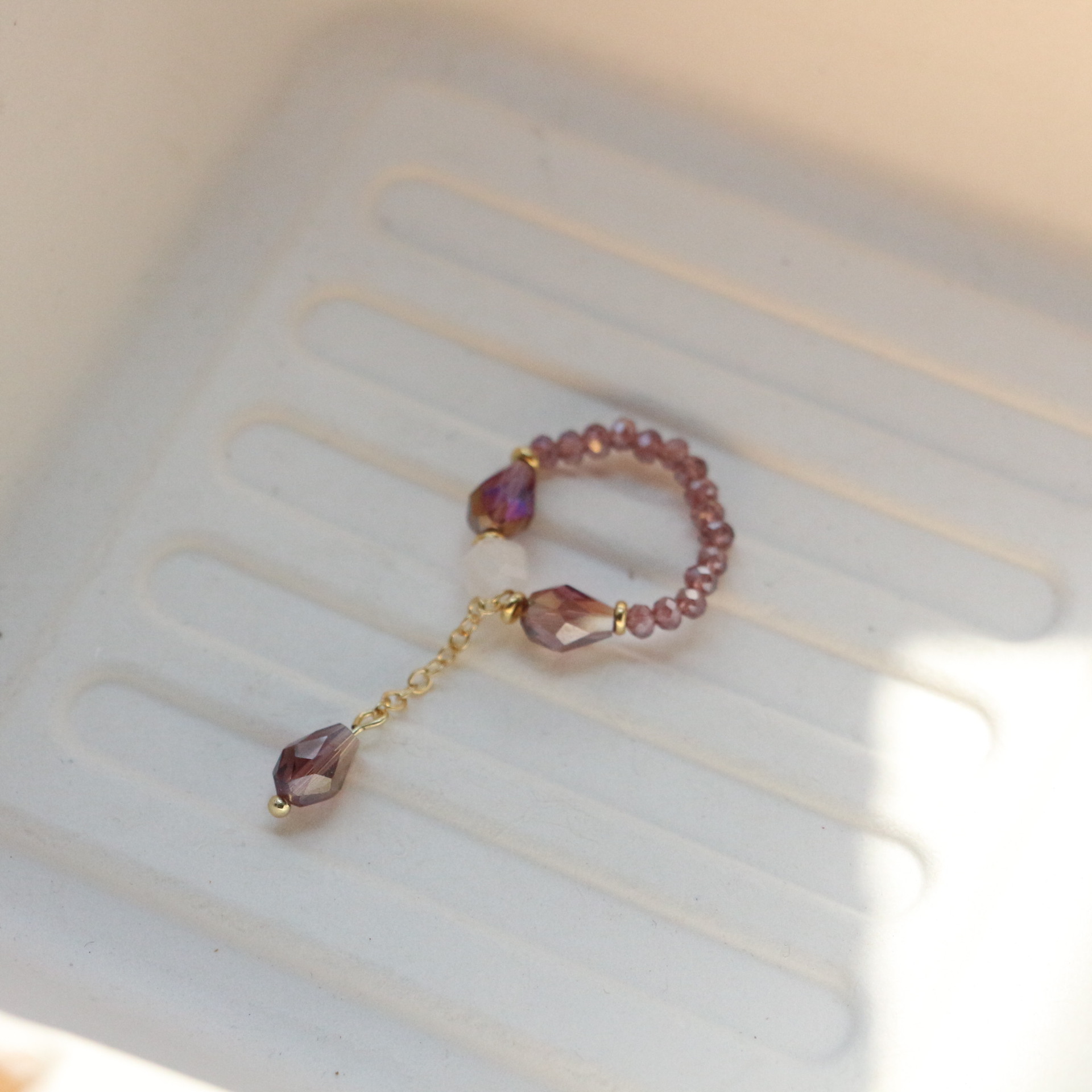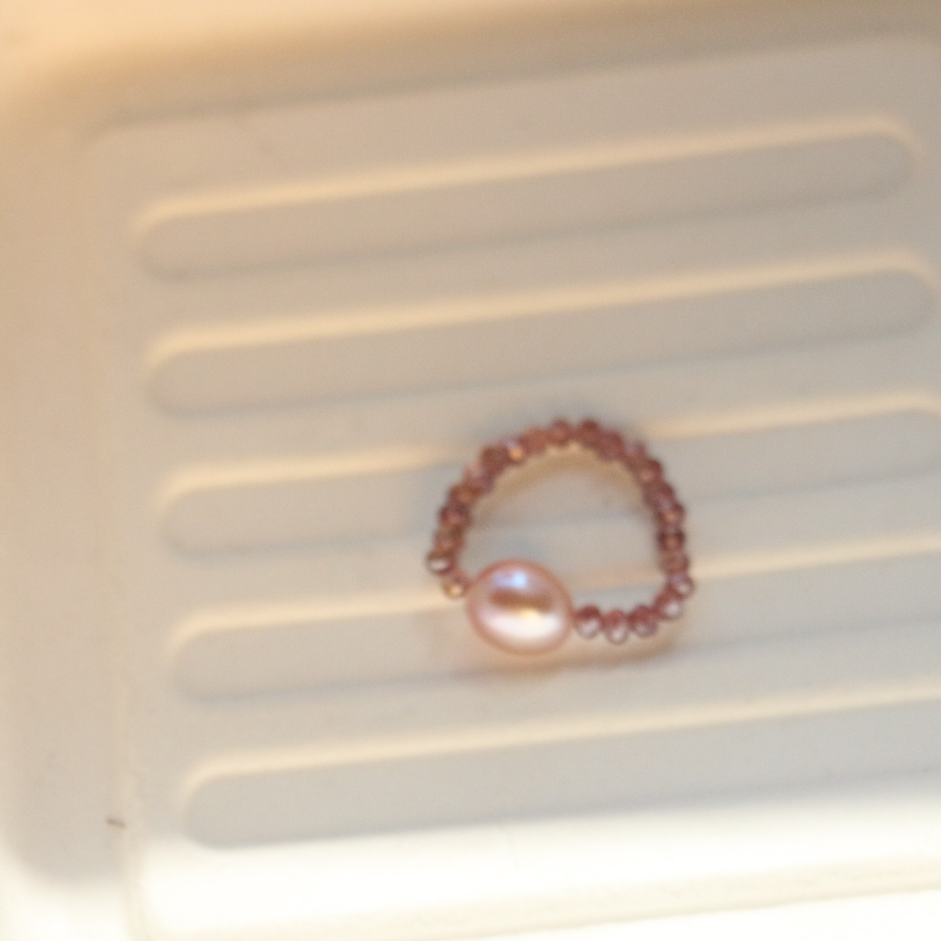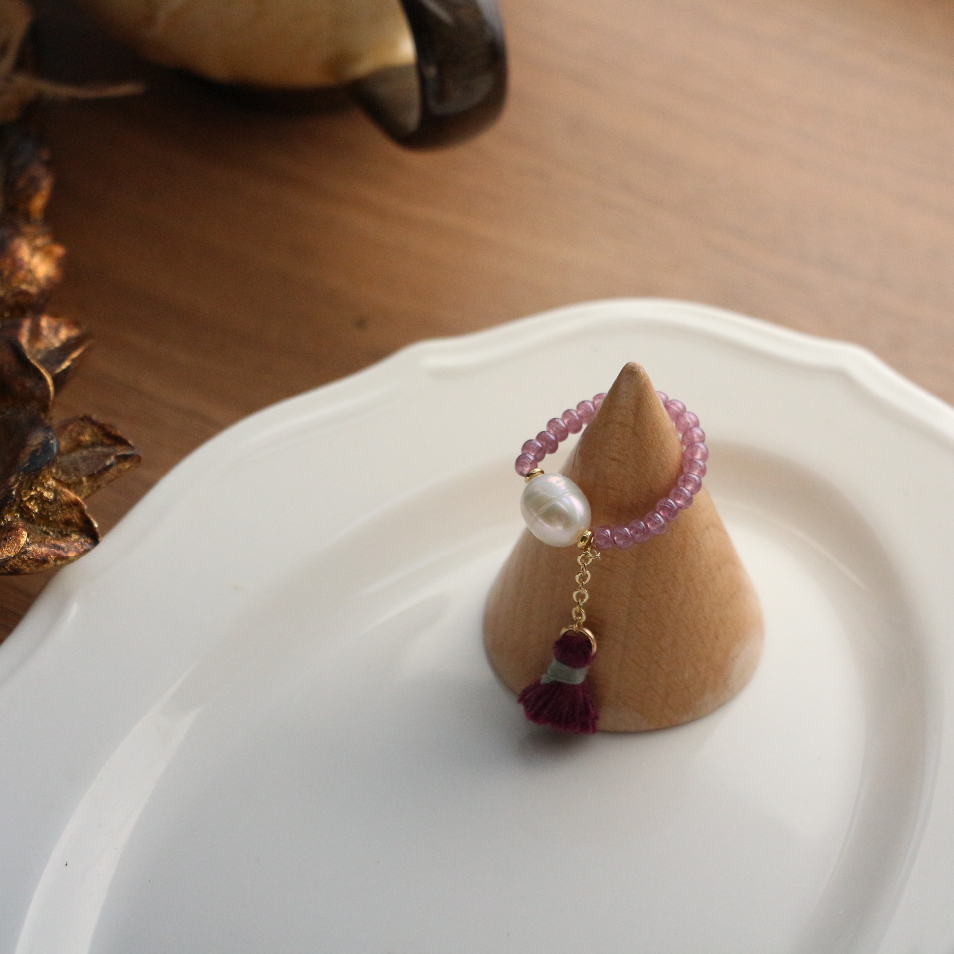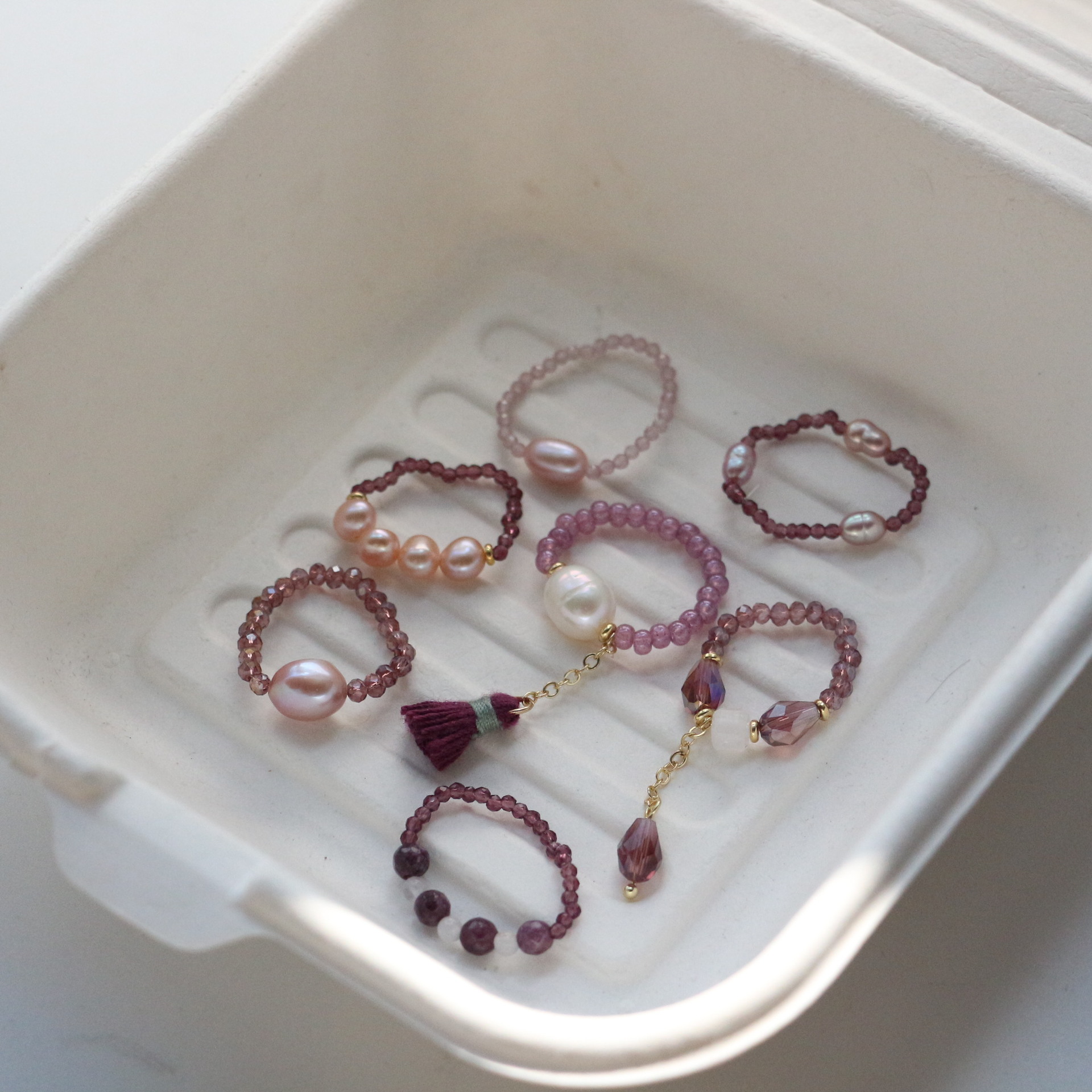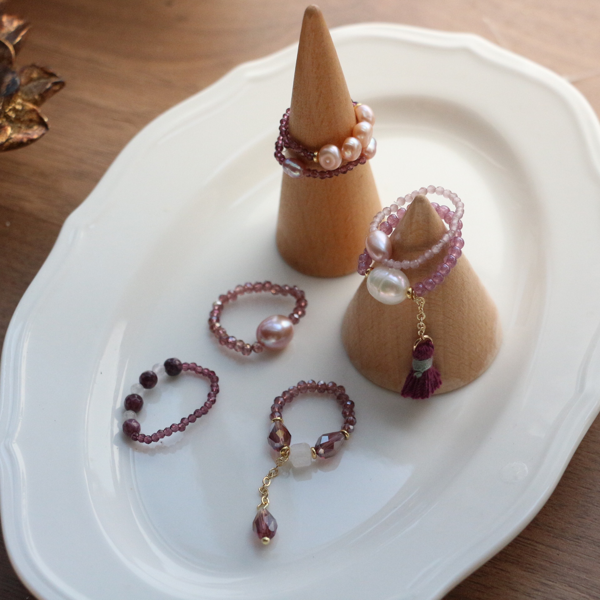 淡水パールソースパープルタッセルリング,バロック淡水ピンクパールリング,ガラスクリスタルペンダントリング,ティンカーベルリング,ピンクとパープルのライスビーズリング,花びらパールリング,オーロラライスビーズリング