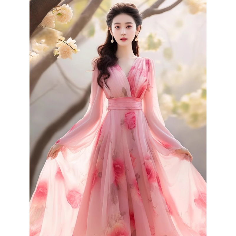 2025新作夏フレンチワンピースボヘミアンシフォンロングスカートピンク海辺リゾートビーチスカート