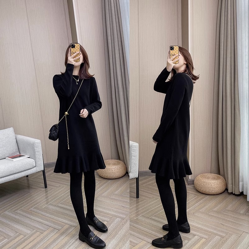 2025年秋新作 レディース フレンチヘップバーン風 マーメイドライン ブラックニットワンピース インナー レイヤードワンピース 8265