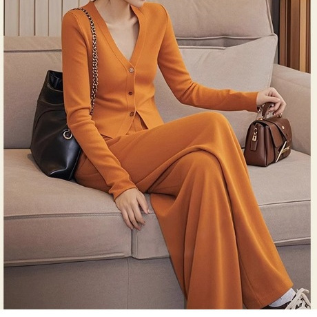 3036塩系軽熟オレンジ色ニットカーディガン上着ワイドパンツ2点セット秋装女装新作ファッション