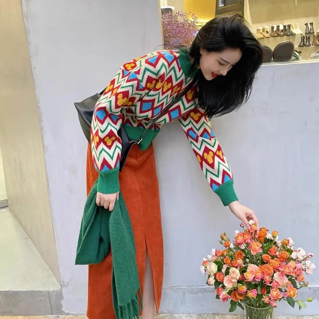 4060韓国系は冬服のカレー色のセーターのコートのズボンの2つのセットを組み合わせて新型の婦人服を着ます。