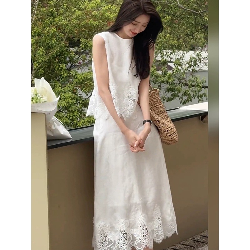 4301 ヨーロッパスタイルの女性のための年齢を減らすスーツ夏の新しいノースリーブ中空レーストップスとスカートの2点セット