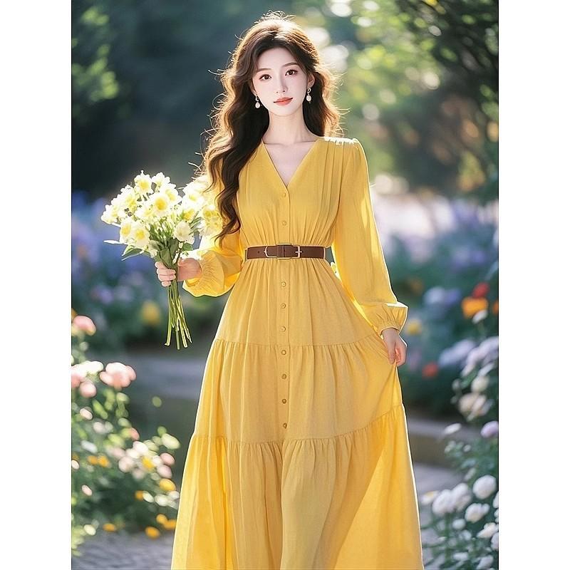 絶美のハイエンドの精巧で美しい気質は腰の長いスカートの簡単で気前が良い高級感の黄色のワンピースの女性の2025春を収めます。