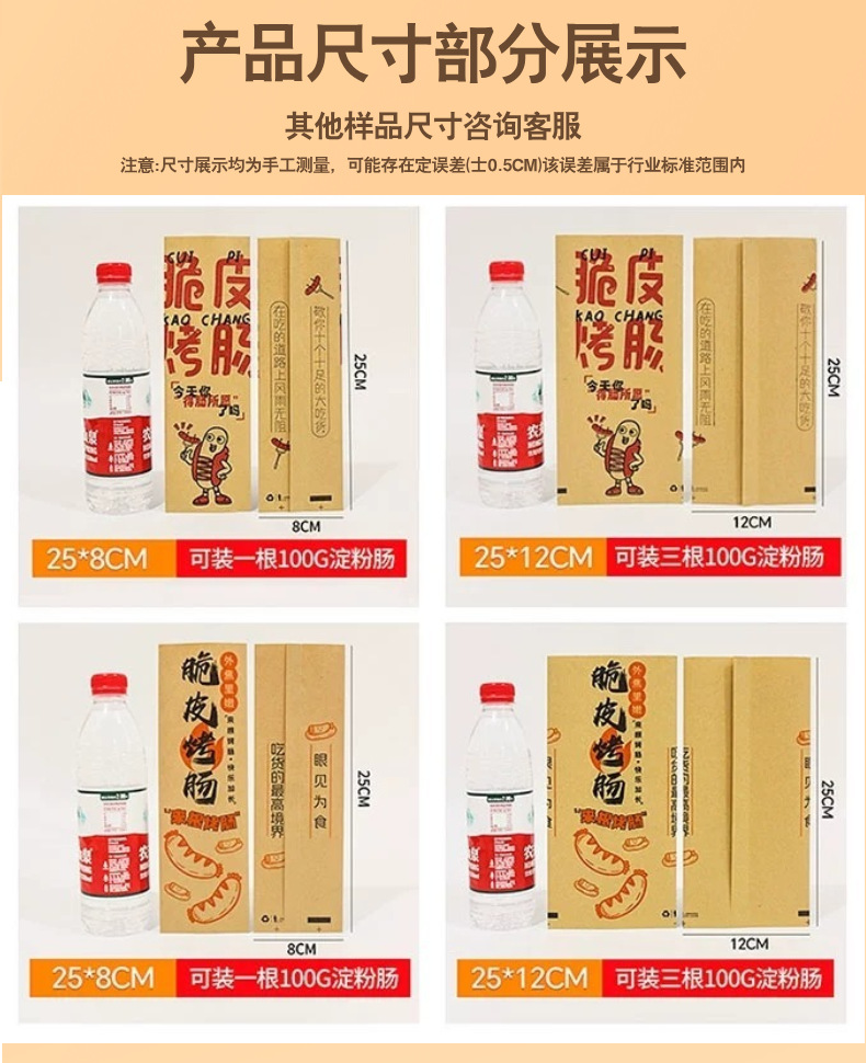 仕様とモデル トゥルーカラー [腸に望むもの] 25*8cm (1 個収納可能); 100 個/個 [カスタマイズはさらに割引]; クラフト紙,トゥルーカラー [腸に望むもの] 25*10cm (スティック2本収納可能); 100個/個 [カスタマイズはさらに割引]; クラフト紙,トゥルーカラー [グリルソーセージ] 25*8cm (1 本収納可能)、100 個/個 [カスタマイズするとさらに割引]、クラフト紙,トゥルーカラー [グリルソーセージ] 25*10cm (ソーセージ2本収納可能)、100個/個 [カスタマイズするとさらに割引]、クラフト紙