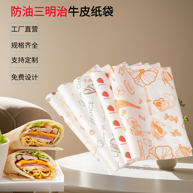 サンドイッチ用牛革色吸油包装紙、寿司用耐油紙、ロールパン用トレイ紙、ハンバーガー用牛革紙、カスタムメイド