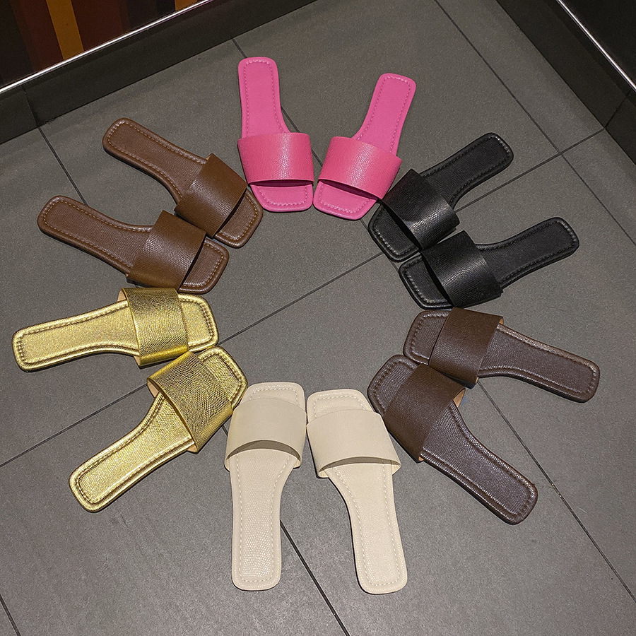 2025年新作、シンプルなメタルフラワーバックル付き、ファッショナブルなレディーススリッパ、スクエアトゥ、快適なフラットサンダル