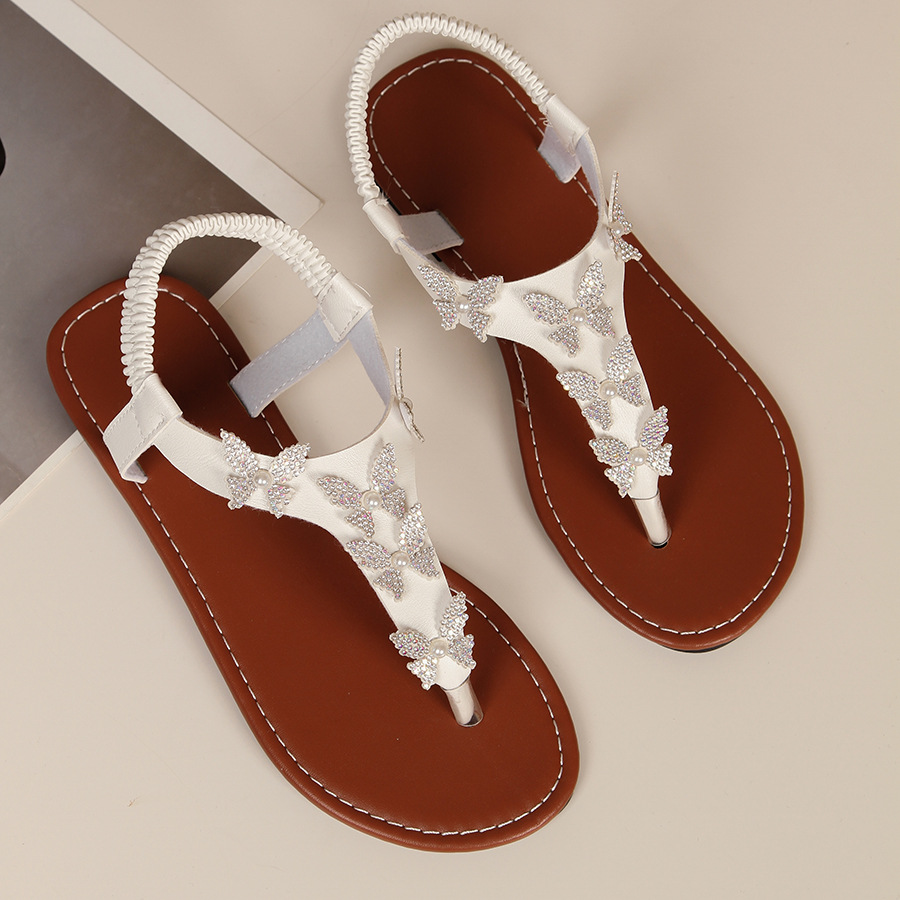 平底ビーチサンダル レディース 欧米風 2025年夏新作 大きいサイズ ゴムバンド付き ラインストーン パール 蝶々サンダル