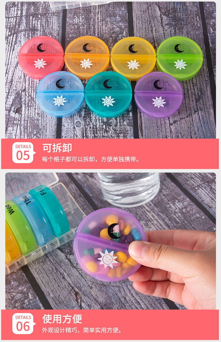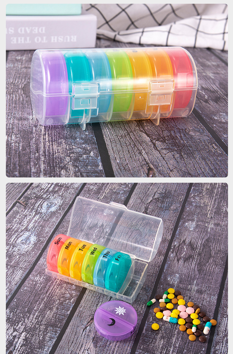 7日間ラウンドミニトラベル防湿14コンパートメントピルボックス、ポータブルで取り外し可能、毎週朝と夕方のプラスチックピルボックスに分割