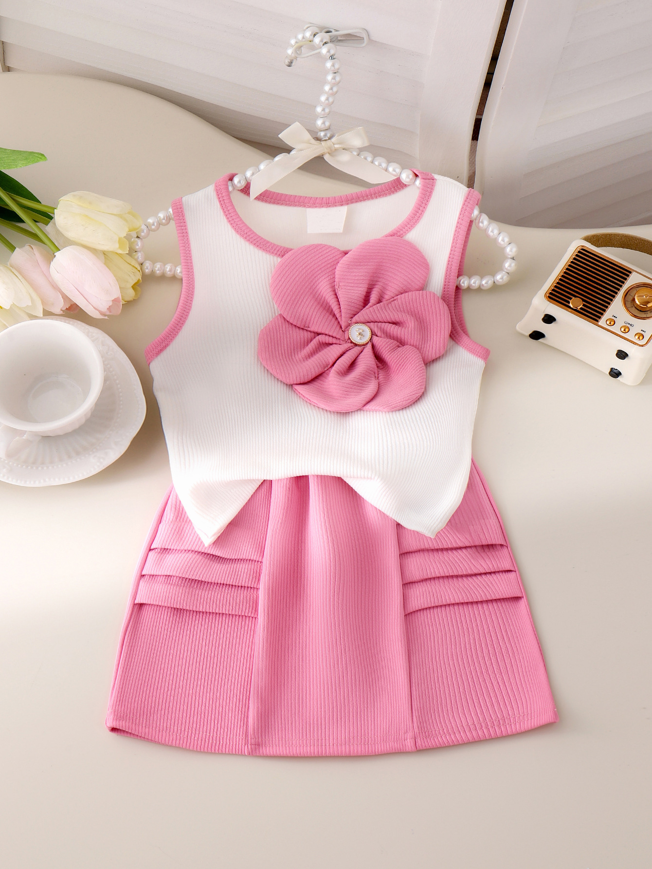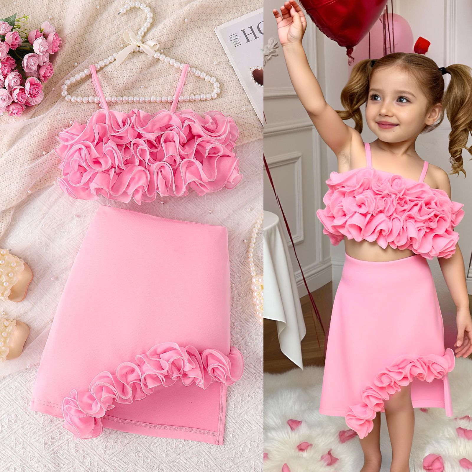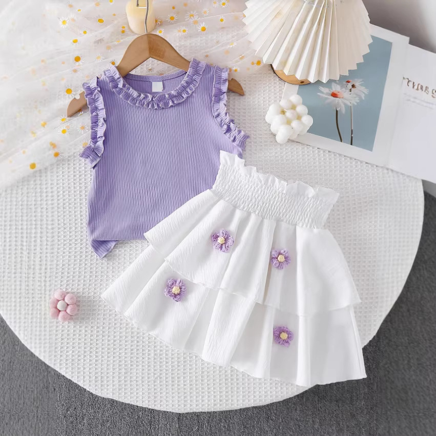 2026春夏新款荷叶边无袖上衣+打揽收腰花朵短裙清新甜美女童套装