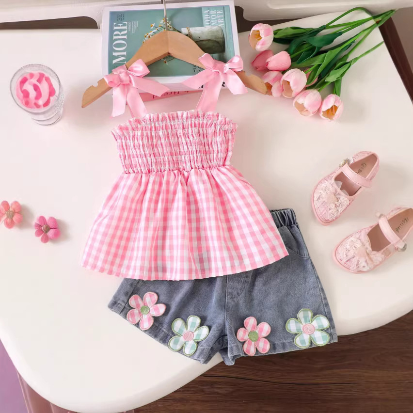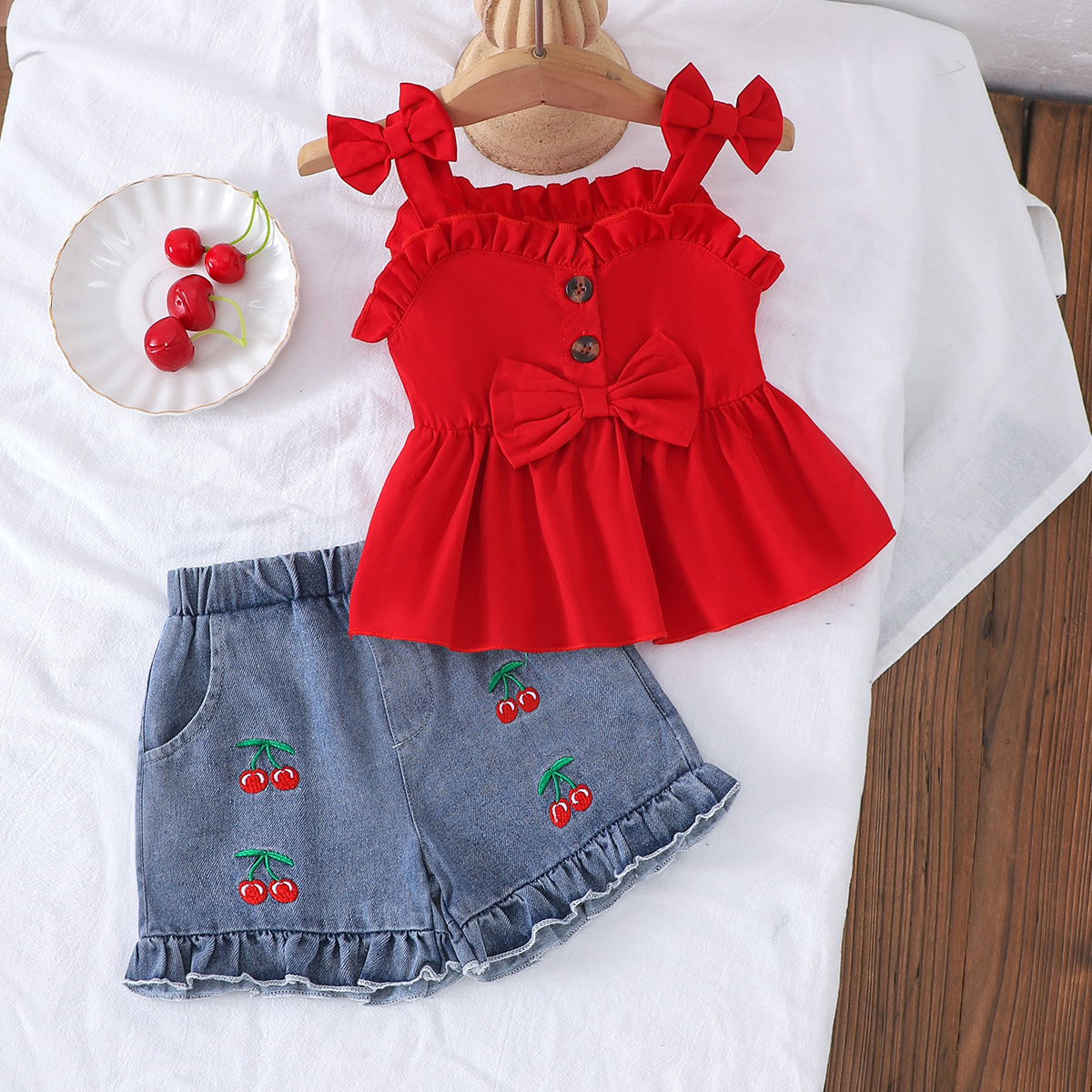 跨境童装新款2025夏女童打揽蝴蝶结吊带上衣+樱桃牛仔短裤两件套