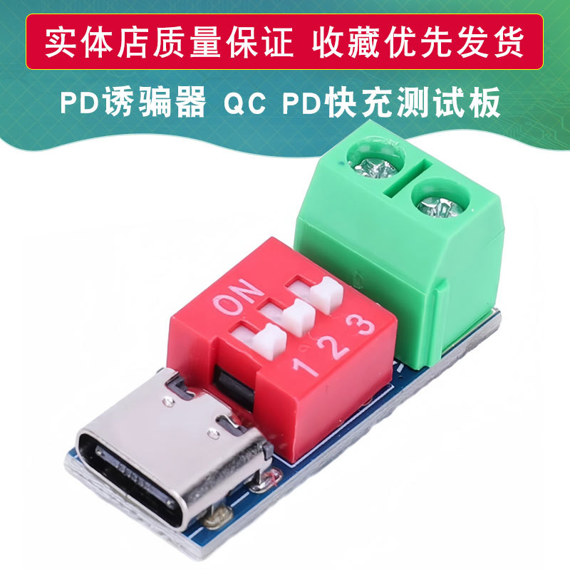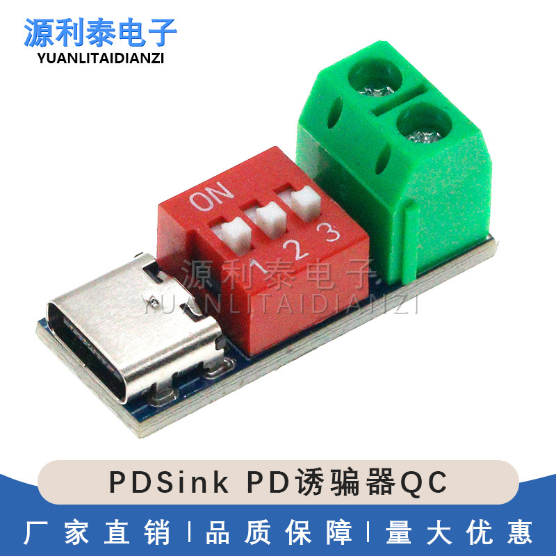 PD诱骗器支持PD3.0/2.0,BC1.2等升压快充协议,最高支持100w功率,并且提供过温、过压保护等功能。电压可通过拨码开关调节,输出电压最高20V。