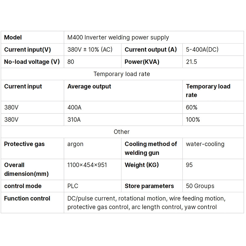 The M400 inverter welding power supply consists of a PLC control system, an imported 400 inverter core, and a cooling water tank. The equipment is progressiveness, digital, easy to operate and reliable.