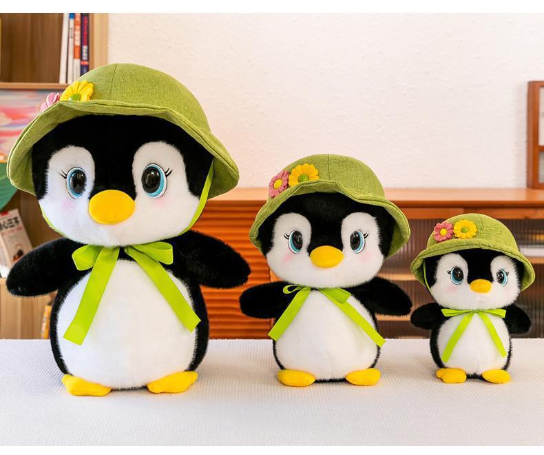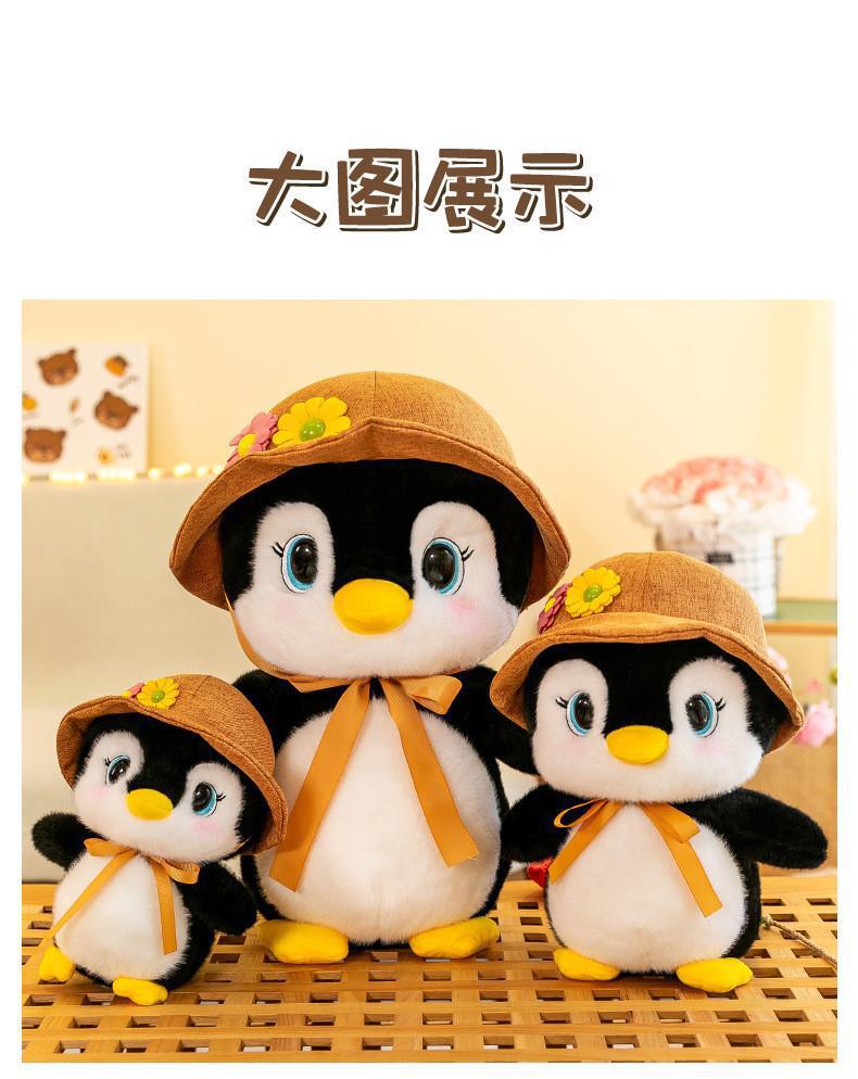 かわいいペンギンの丸い人形が萌えてぬいぐるみの子供が帽子をかぶっているペンギンの女の子が枕を抱いている