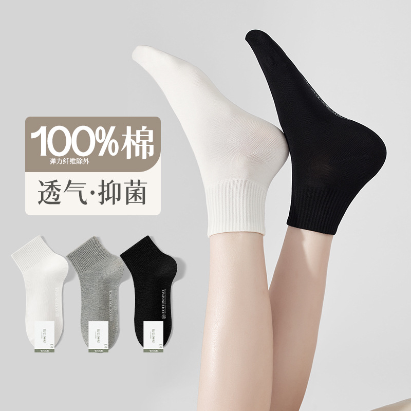 Zhuji 靴下産業純綿靴下女性の春と夏の薄いミディアムショートチューブ抗菌防臭綿ボートソックス黒と白の靴下