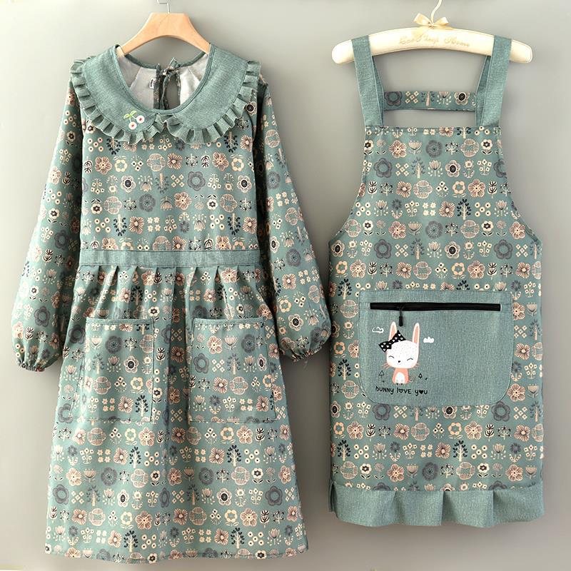 洋気綿布長袖エプロン家庭用キッチン防汚通気料理カバー成人女性韓国版汚れ防止作業服