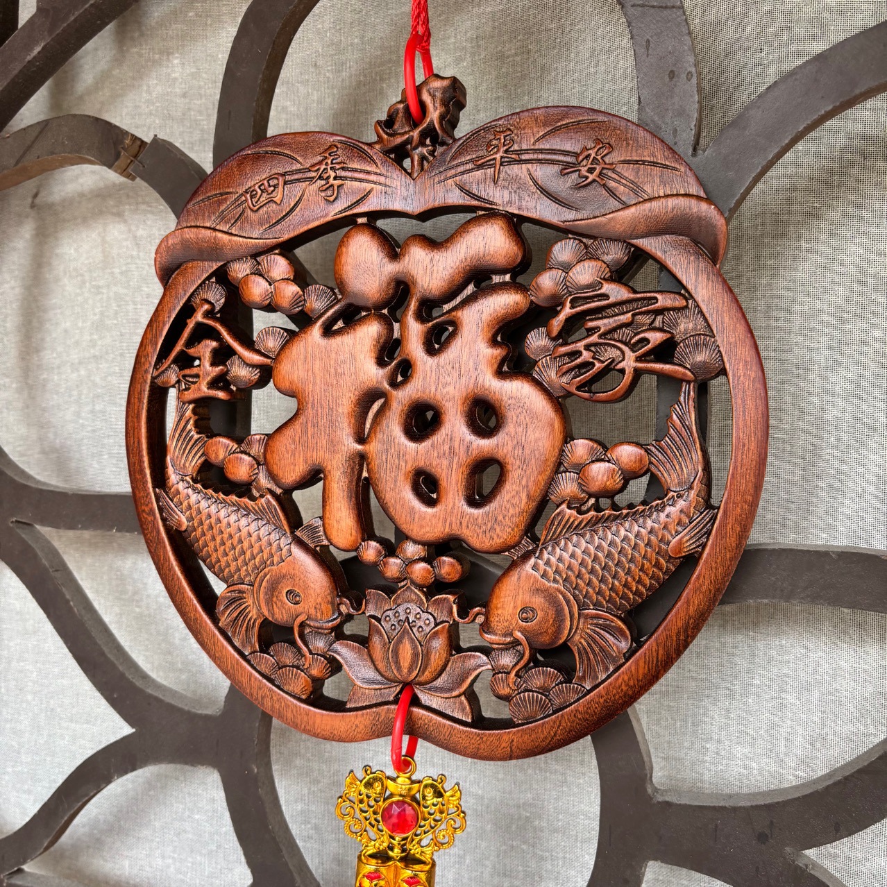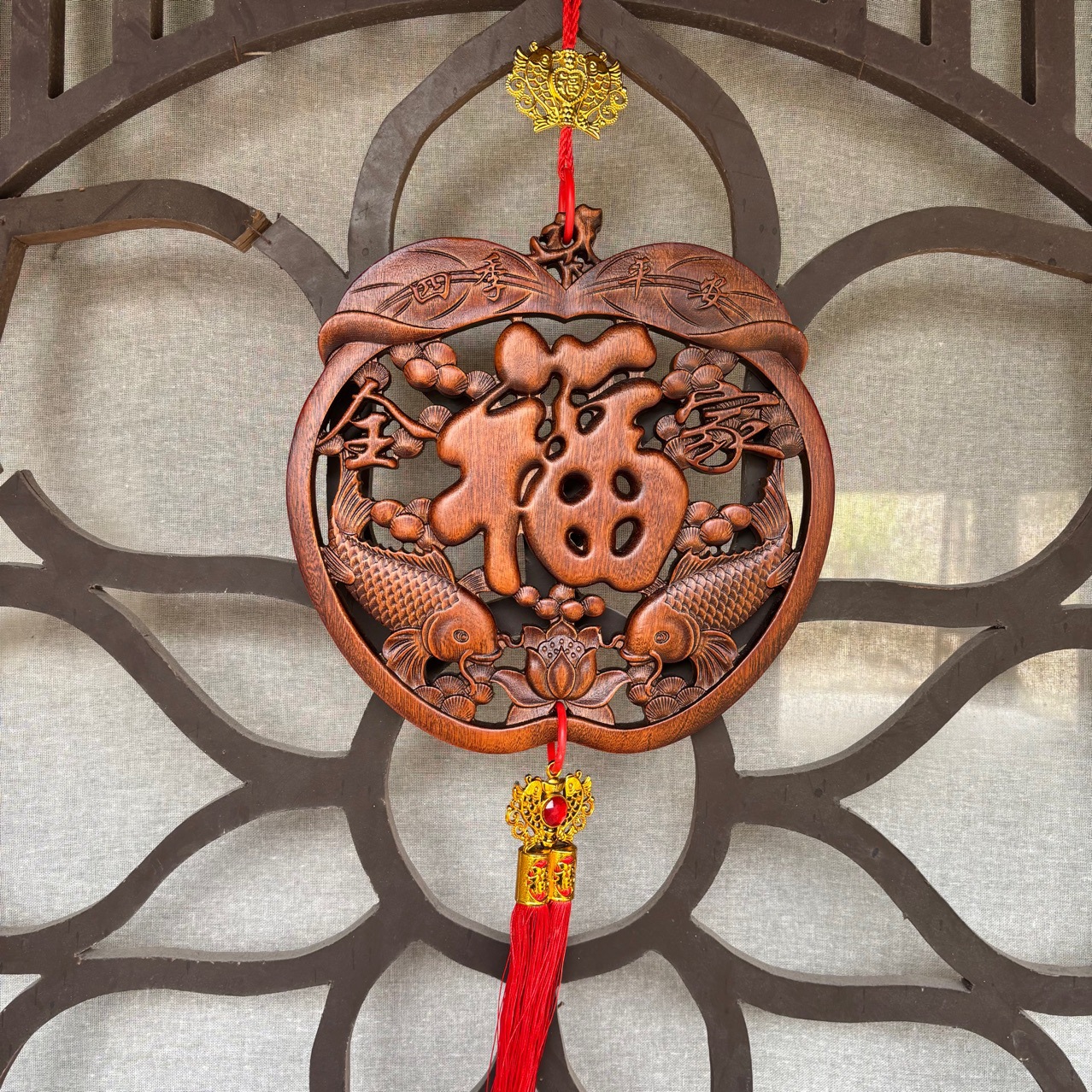 桃木双魚福中国結福字平安富貴ストラップ木彫刻円形実木客間家庭装飾品