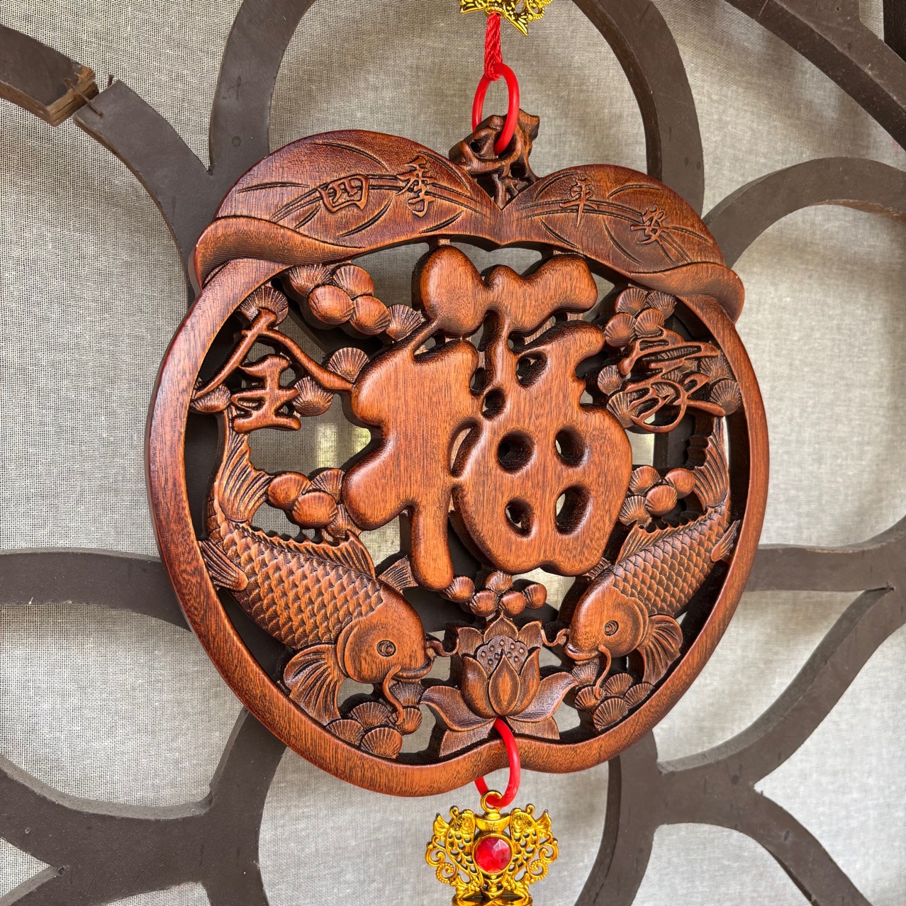 东阳木雕香樟木挂画中式仿古玄关装饰画平安福字背景墙壁挂锦鲤