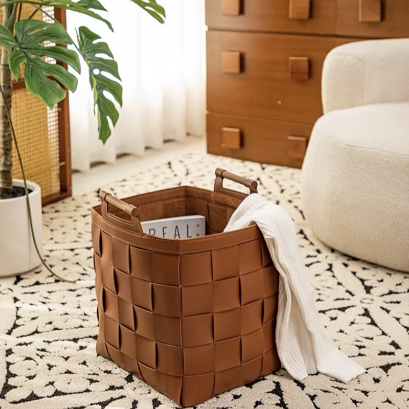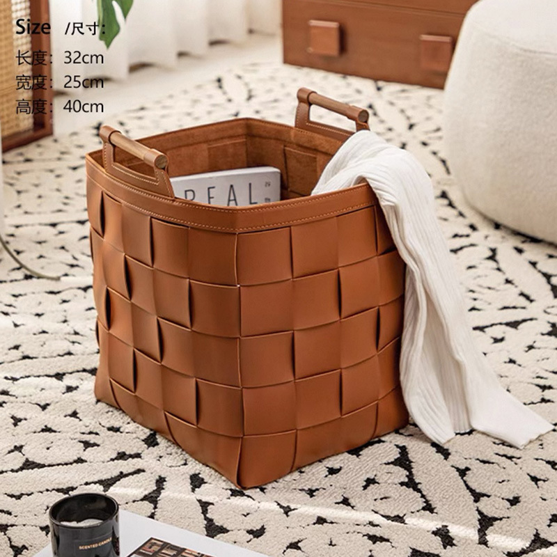 レザー収納バスケット、汚れた衣類バスケット、手織り高級軽量高級収納バスケット、雑貨織り収納バスケット