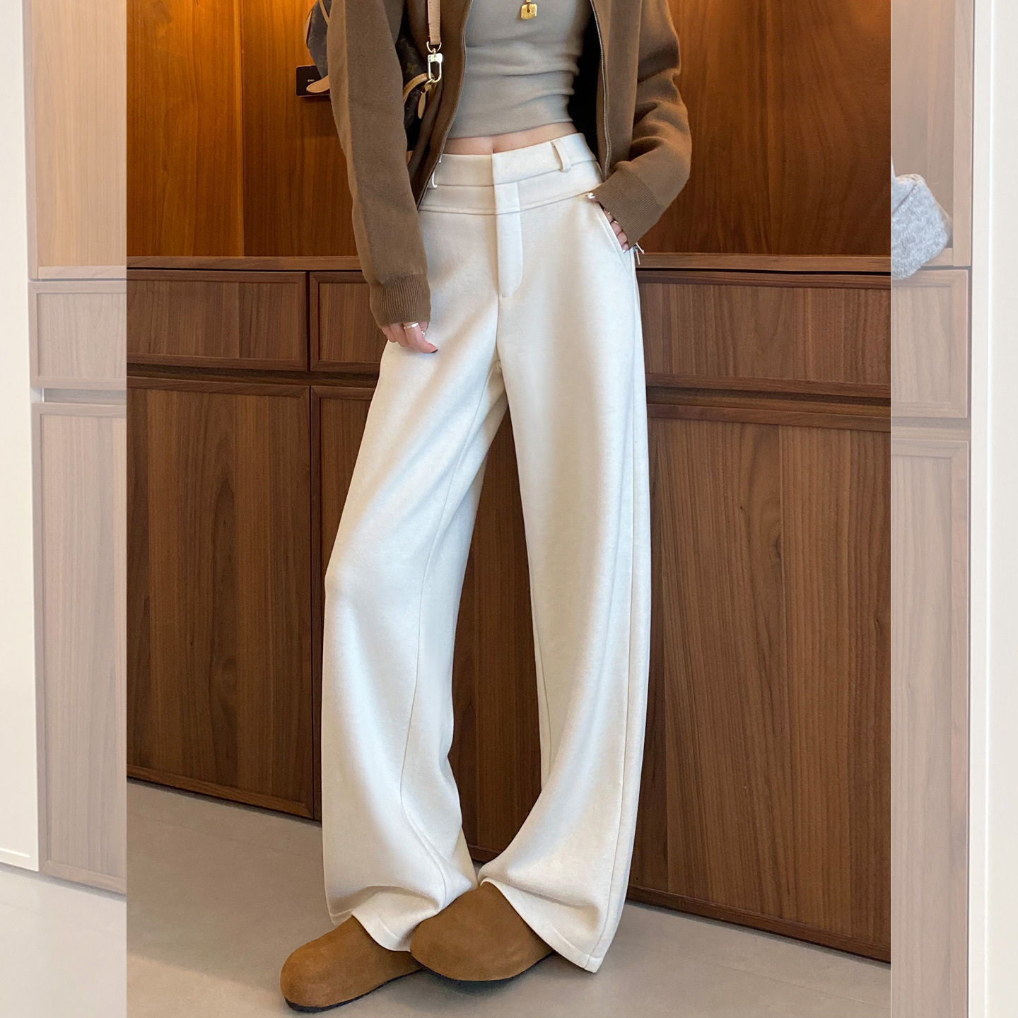 白色醋酸羊毛阔腿裤女秋冬季新款加绒糯米裤窄版加厚直筒西装裤子