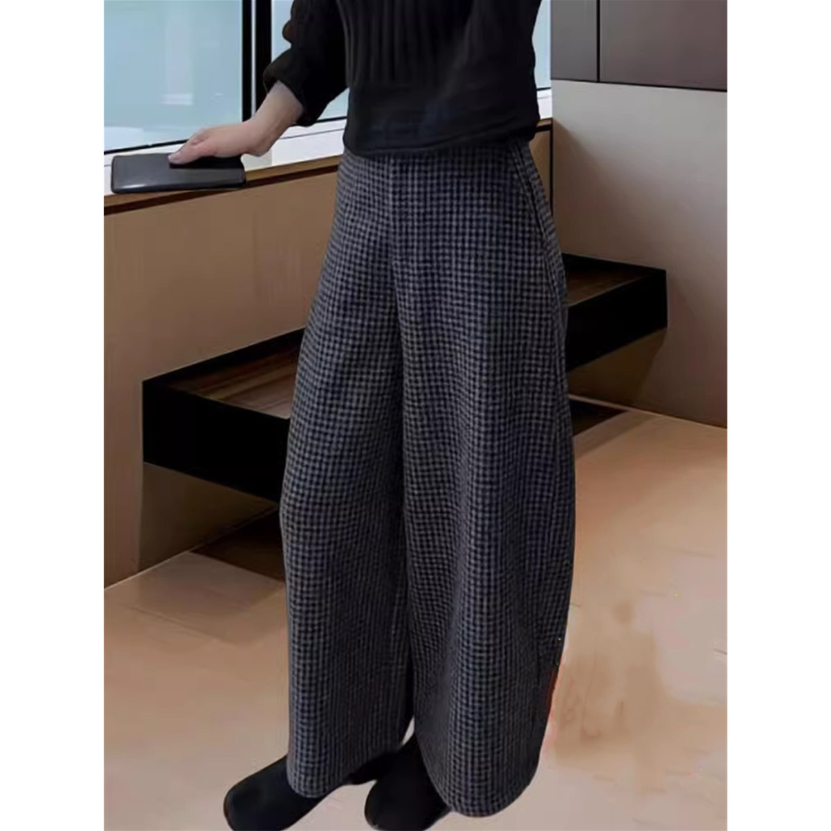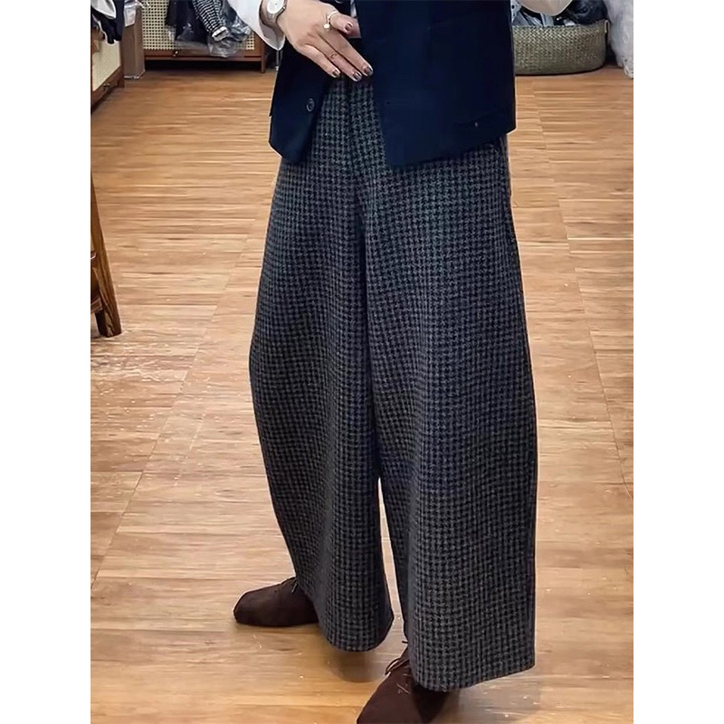 欧品の軽豪華な小衆の黒い格子の毛は鎌のズボンの2024冬の女性のゆったりしていて怠惰な風はやせている刃のズボンを現します。