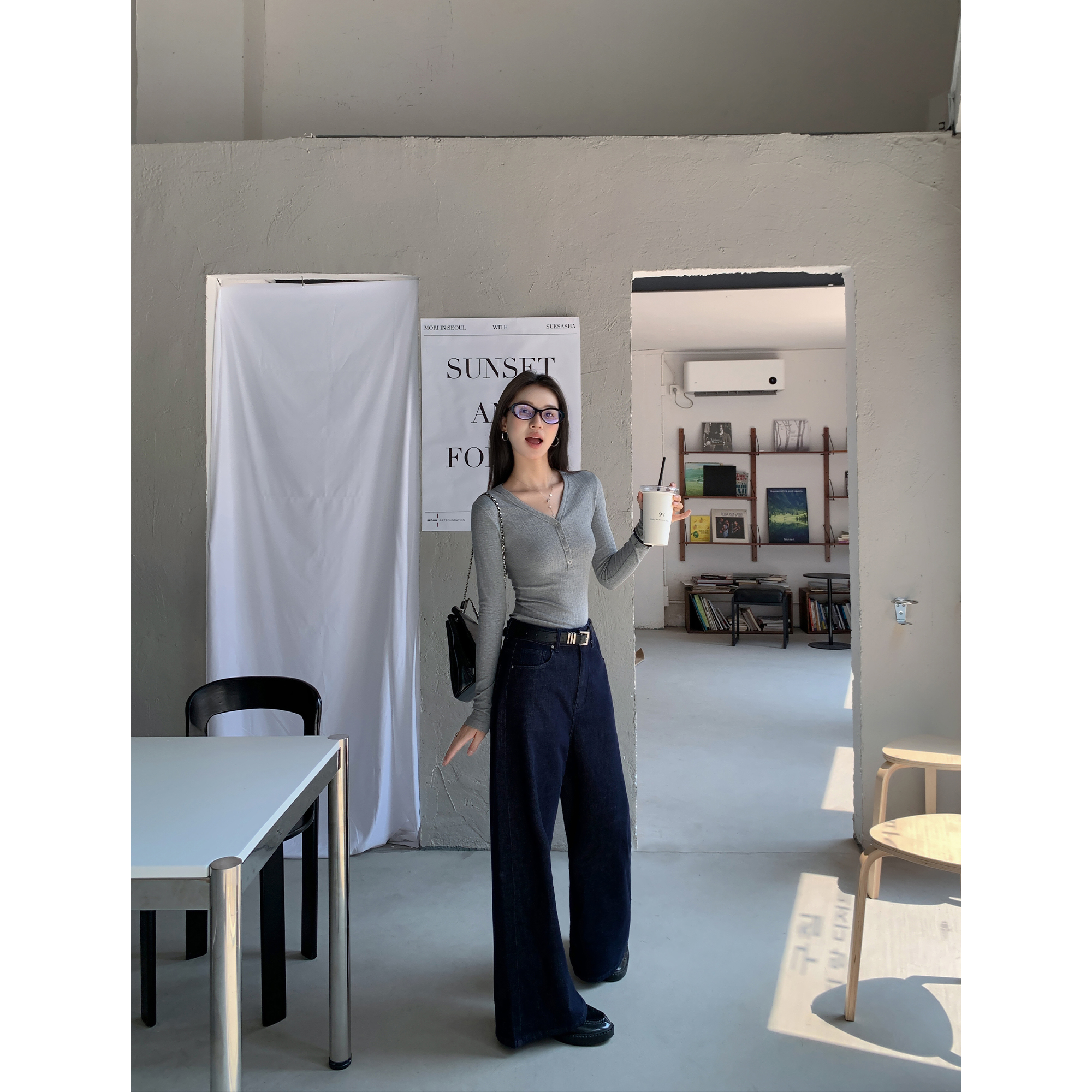 秋冬高腰垂感宽松显瘦直筒长裤格雷系深灰色毛呢西装阔腿裤女