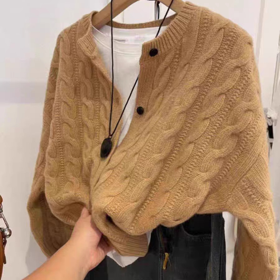 100纯羊毛针织开衫女式圆领外套宽松慵懒风重工复古扭花设计感潮