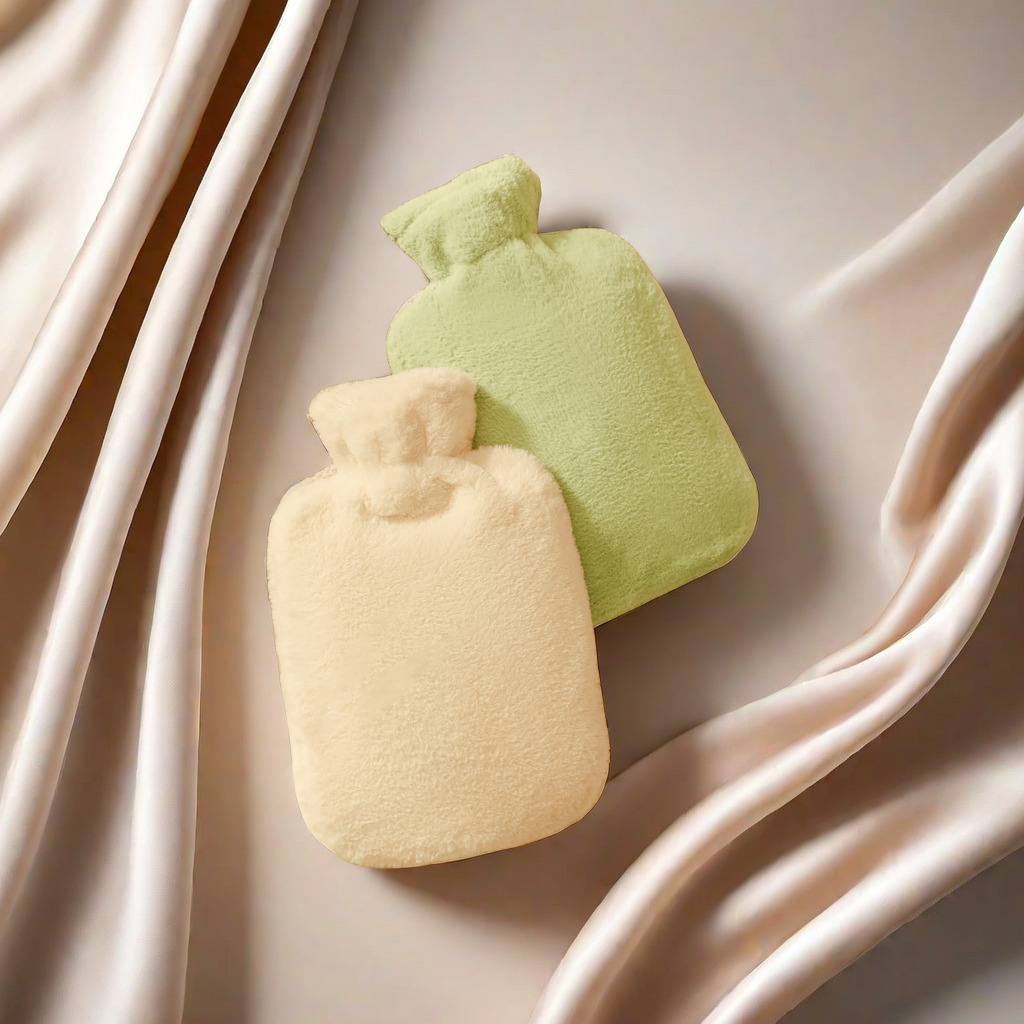 枕型注水式湯たんぽ、昔ながらの厚手の防爆シリコン製、大小サイズ、透明PVC内袋と布カバー付き