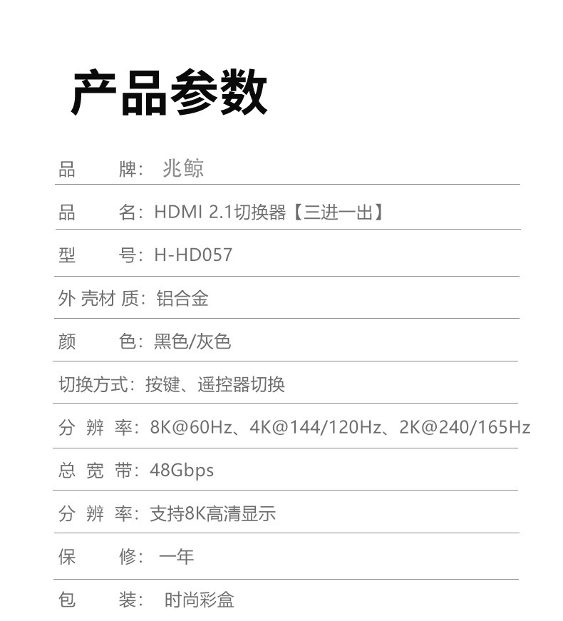 品质HDMI切换器4K 3切1高清游戏机电脑电视3进1出HDMI Switch合金