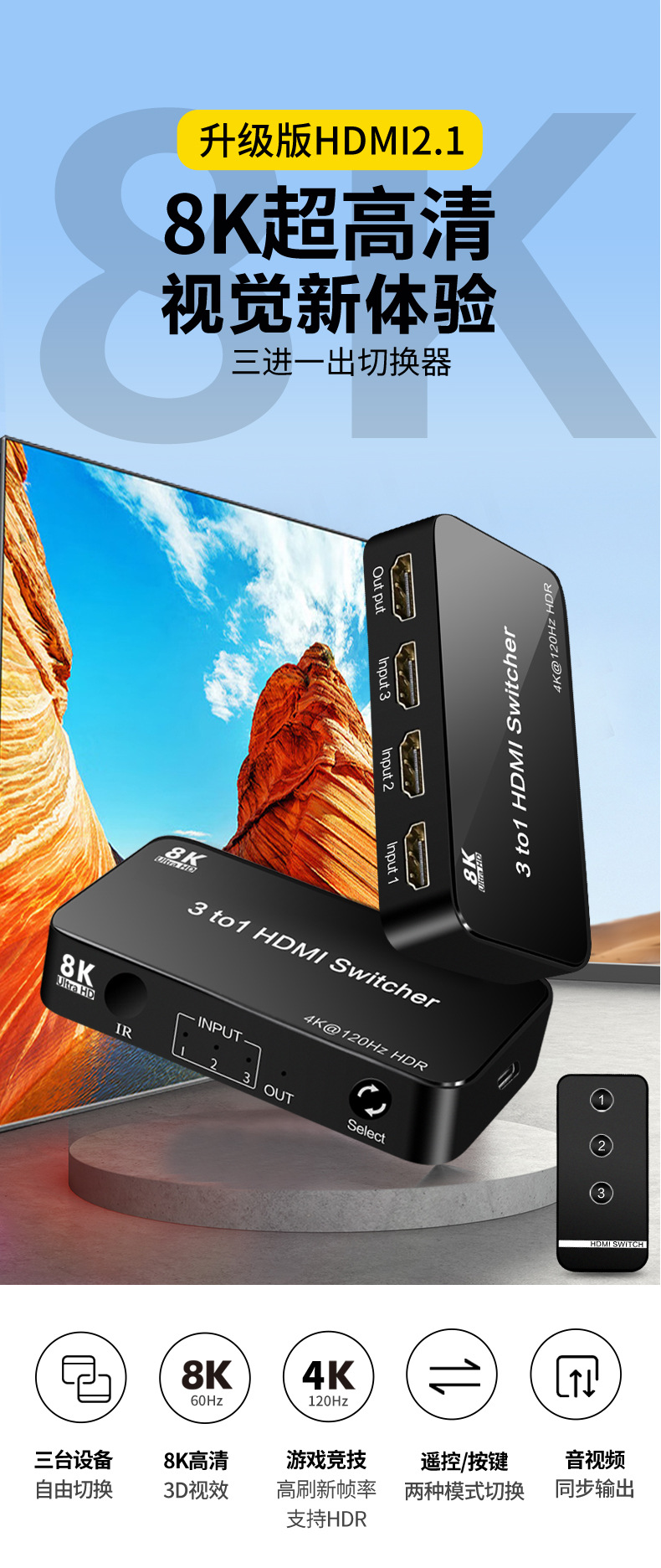 HDMI スイッチャー 3 入力 1 出力 バージョン 2.1 8K60Hz ビデオ コンピューター ノートブックに最適 マルチインターフェース 8K 高解像度