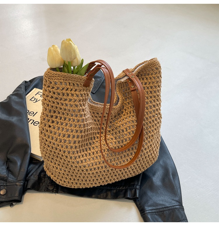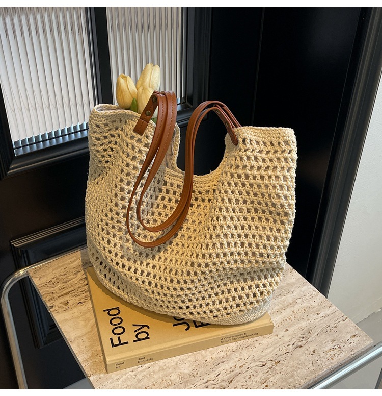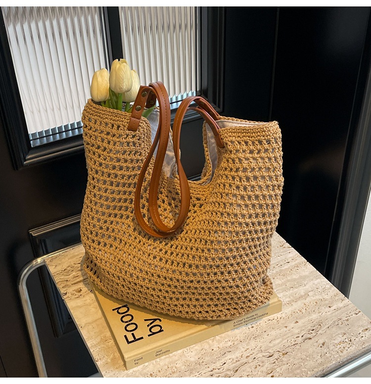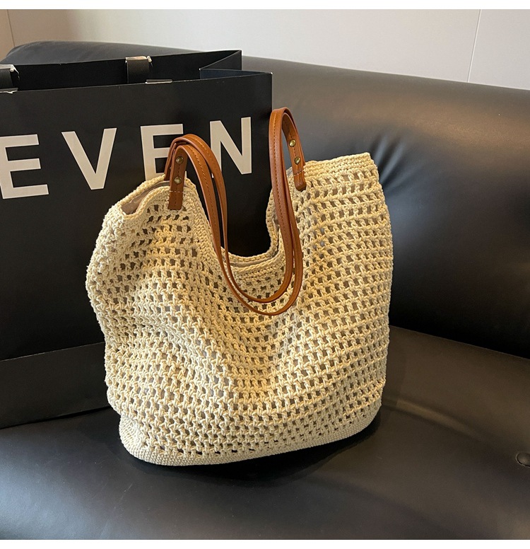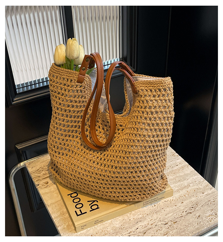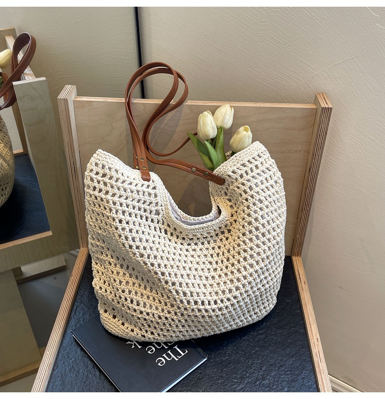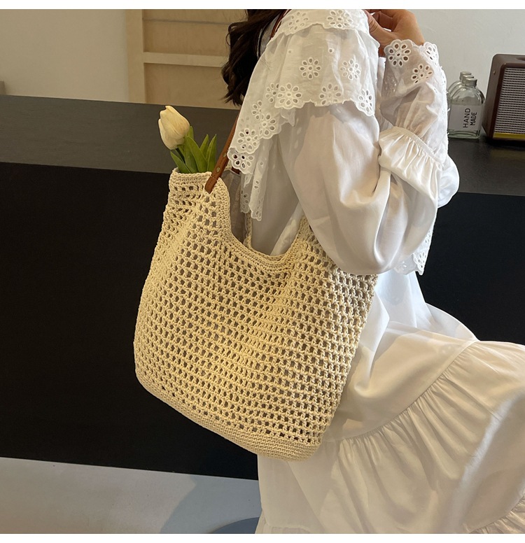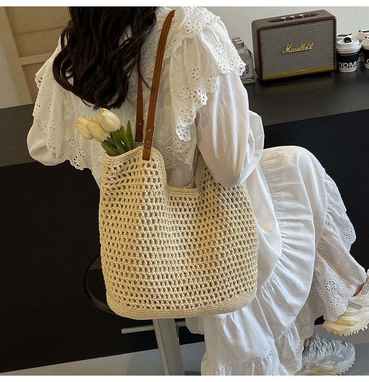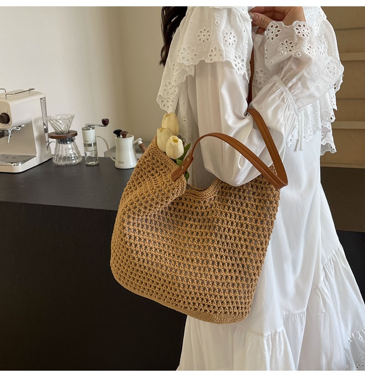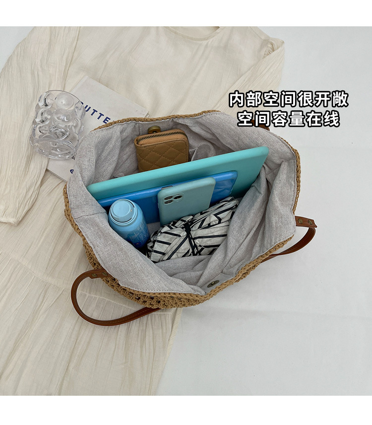 大容量バッグ女性2025新型百合シングル肩海辺休暇ビーチバッグ編み草編通勤バッグ