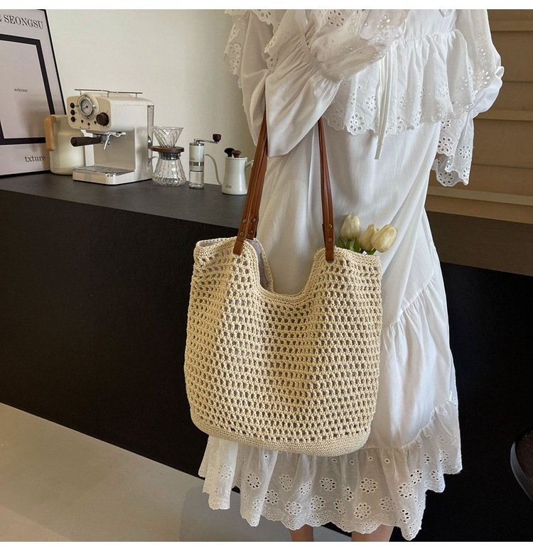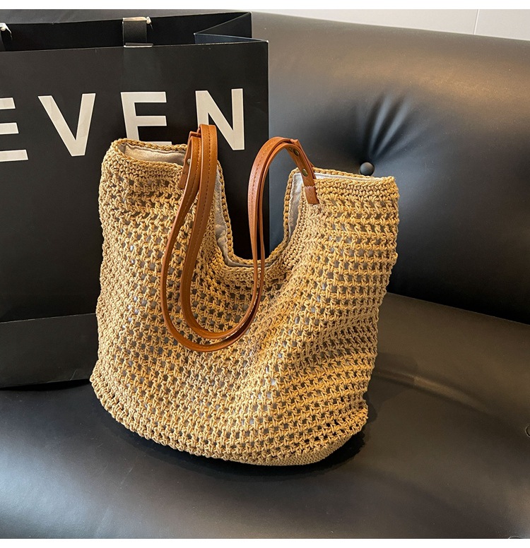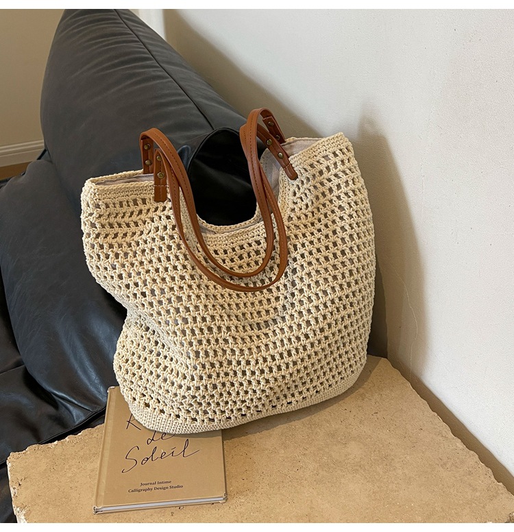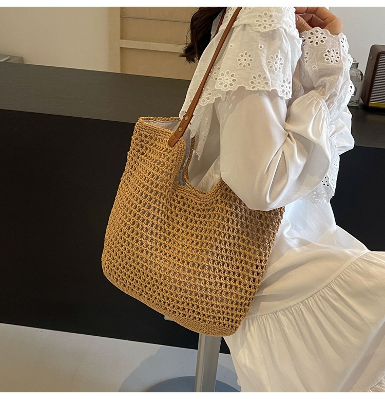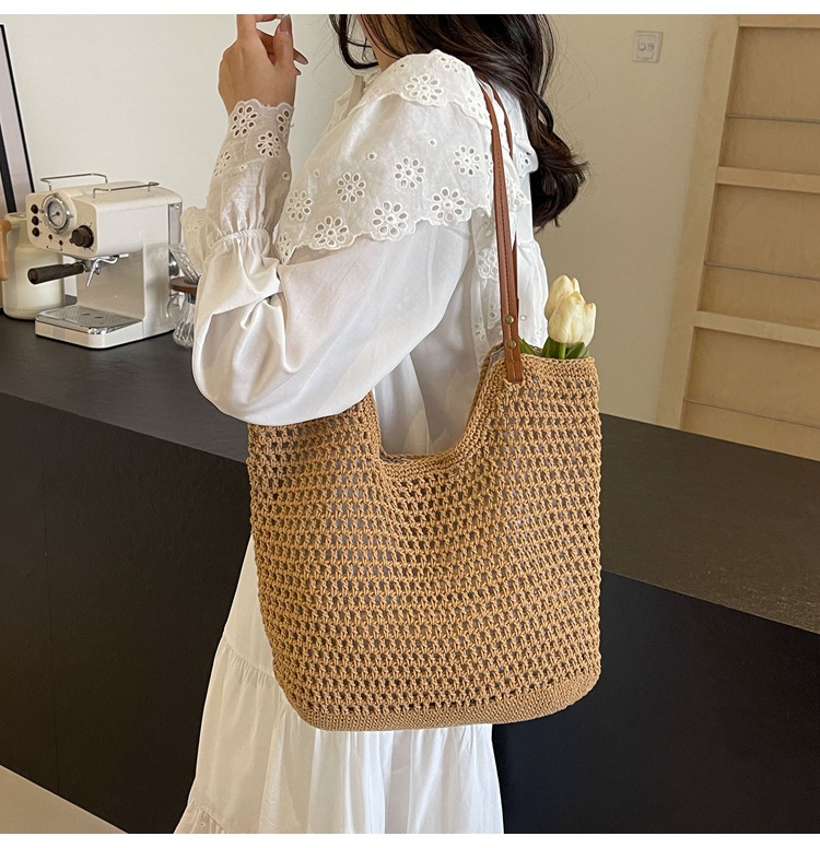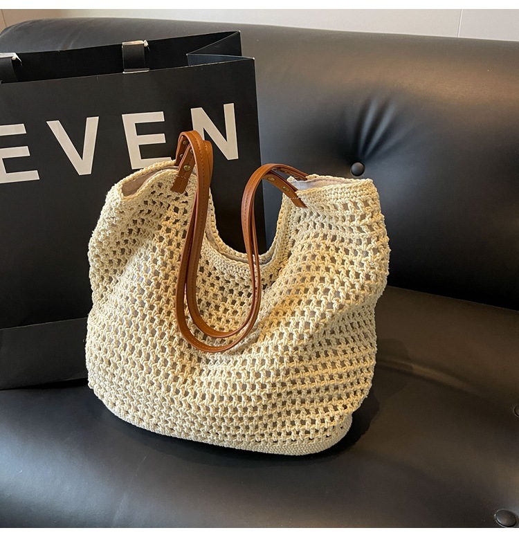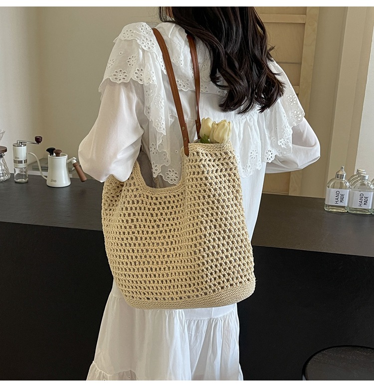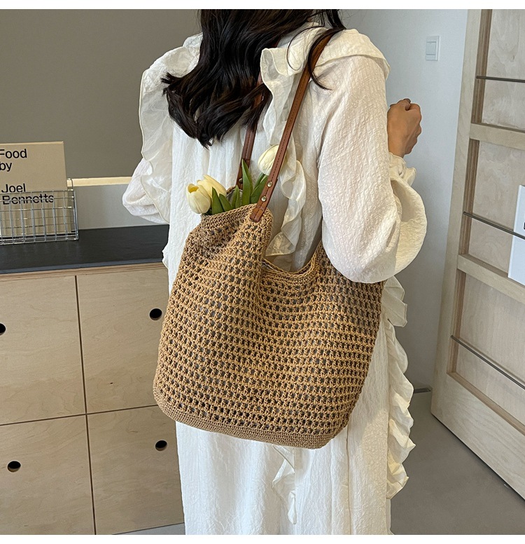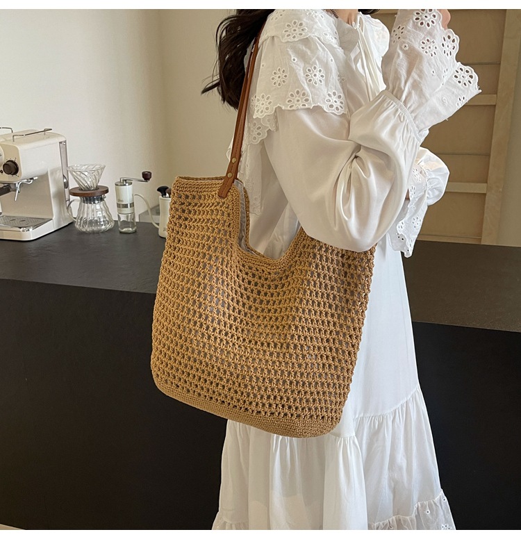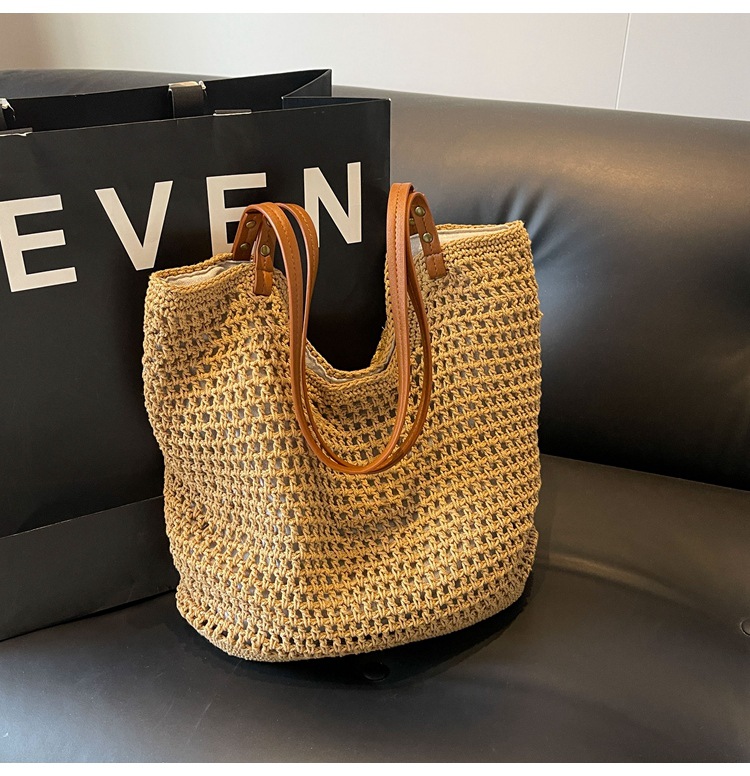 大容量バッグ女性2025新型百合シングル肩海辺休暇ビーチバッグ編み草編通勤バッグ