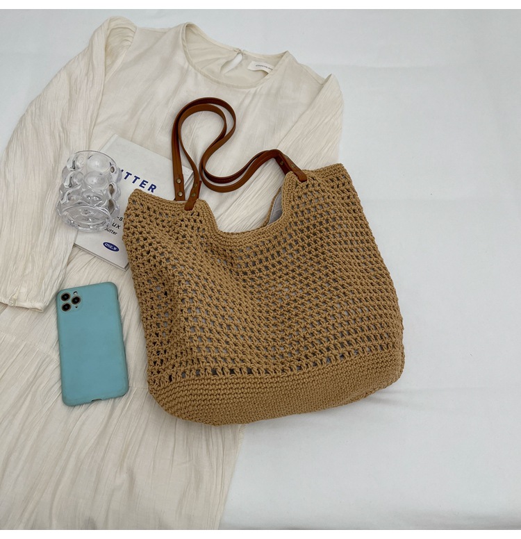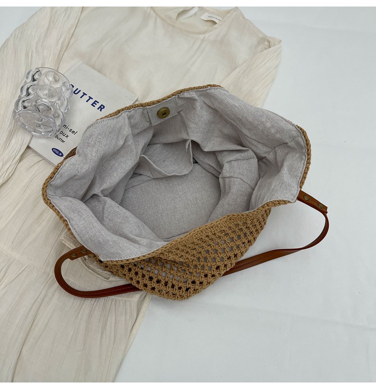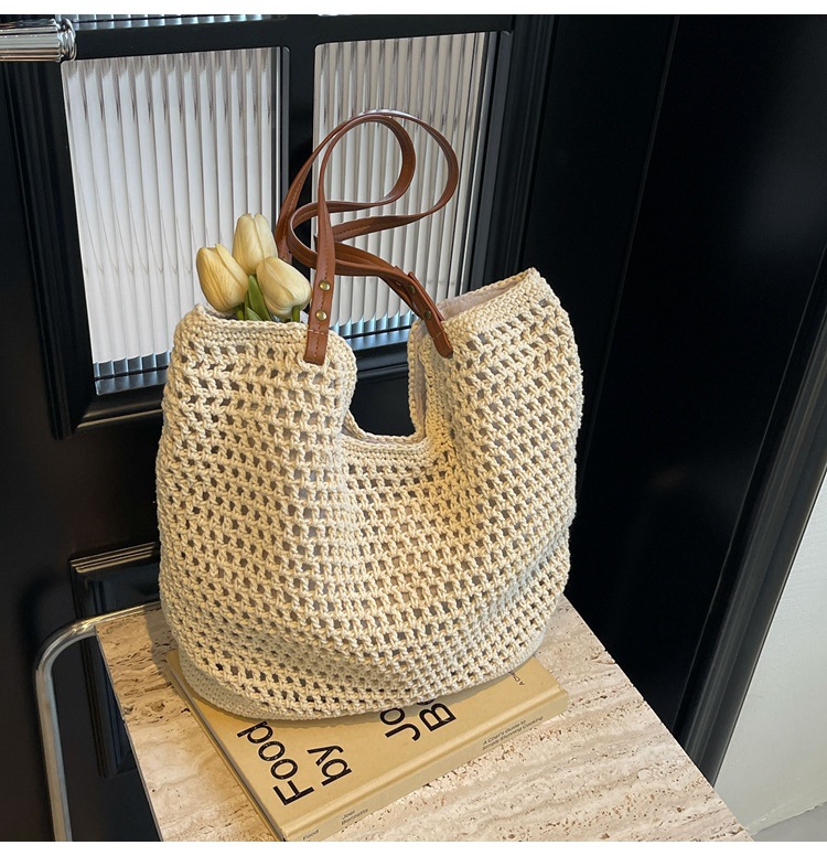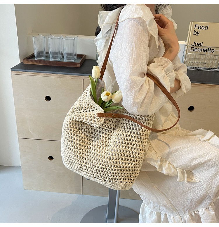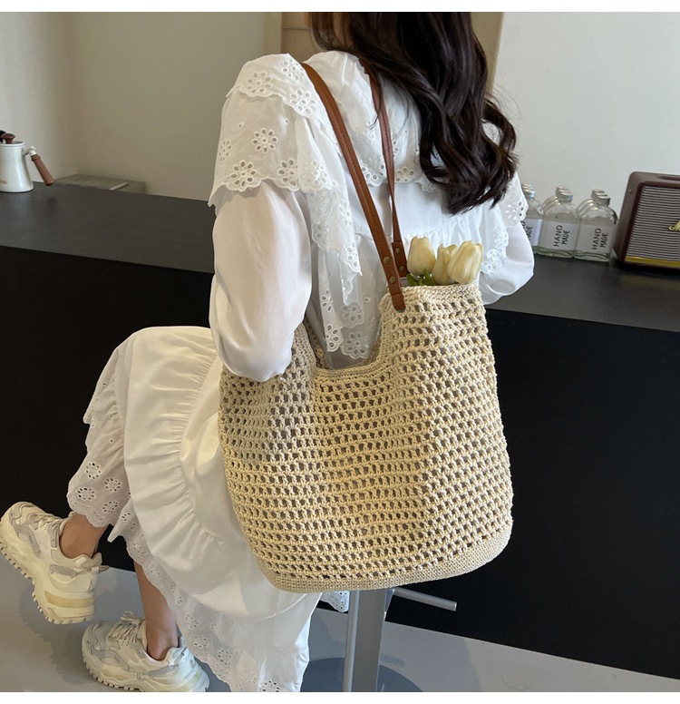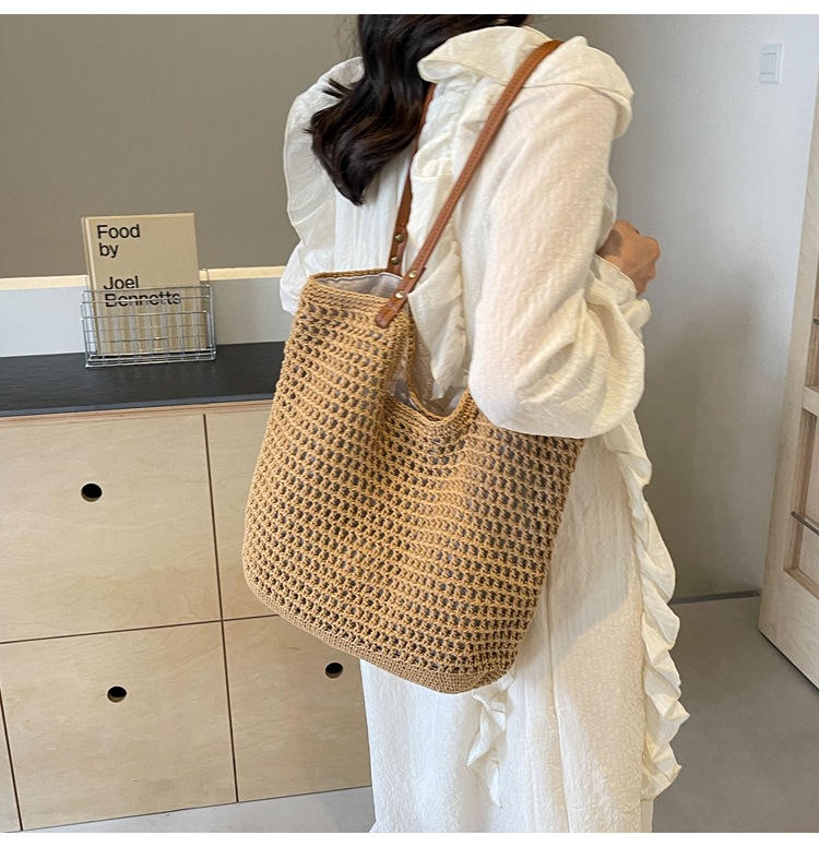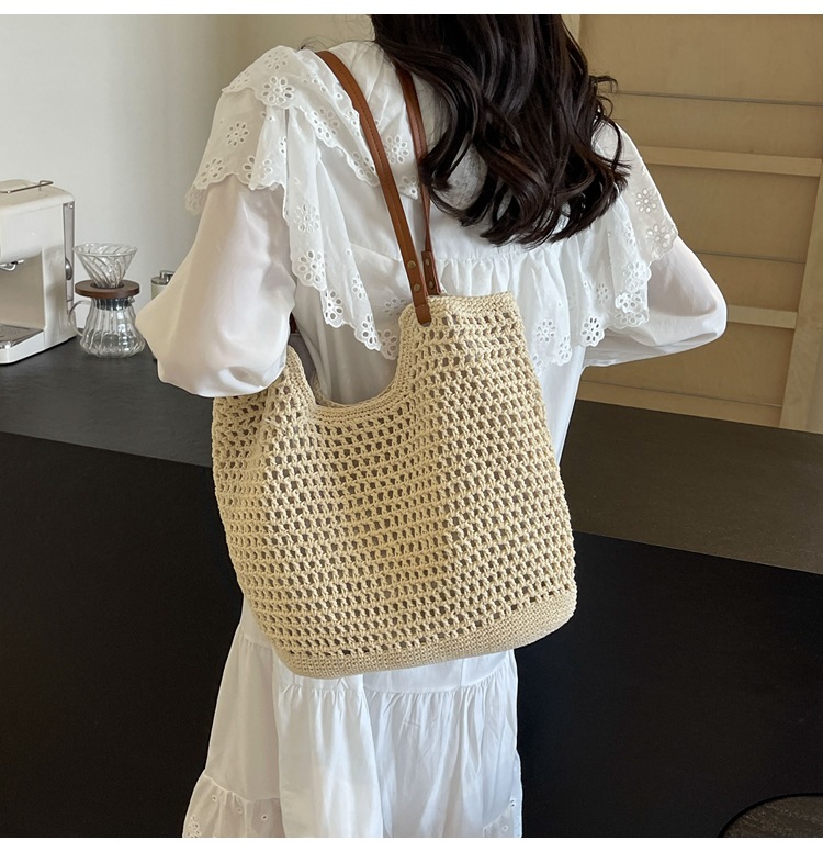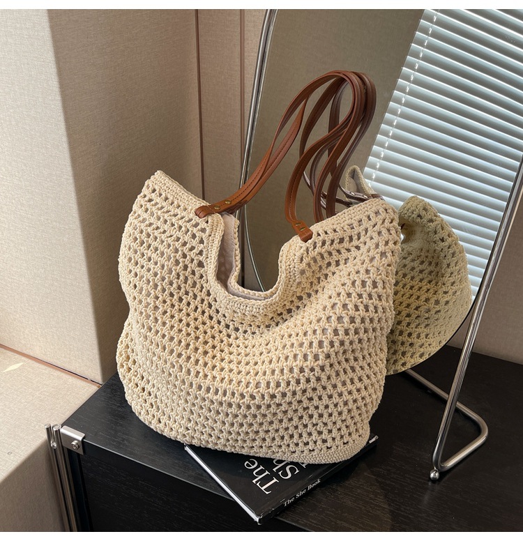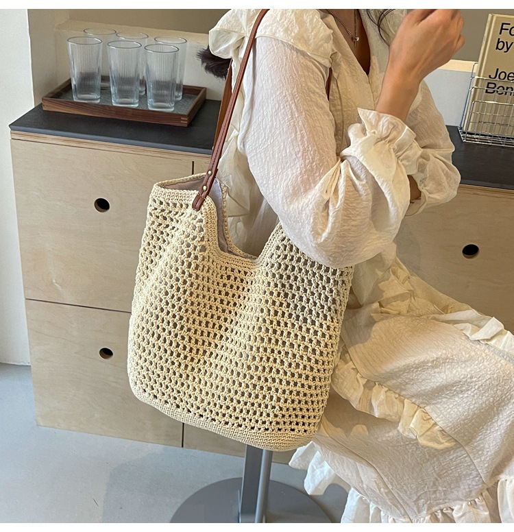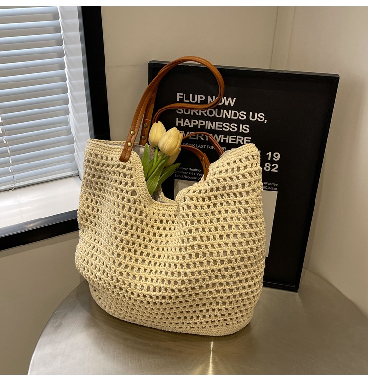 大容量バッグ女性2025新型百合シングル肩海辺休暇ビーチバッグ編み草編通勤バッグ