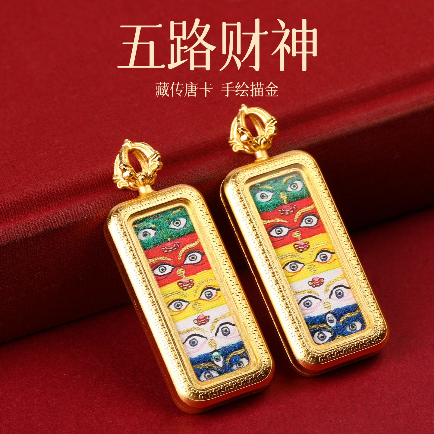 迷你小唐卡半手绘描金扎基拉姆五路财神法眼本命佛小长条唐卡盒吊