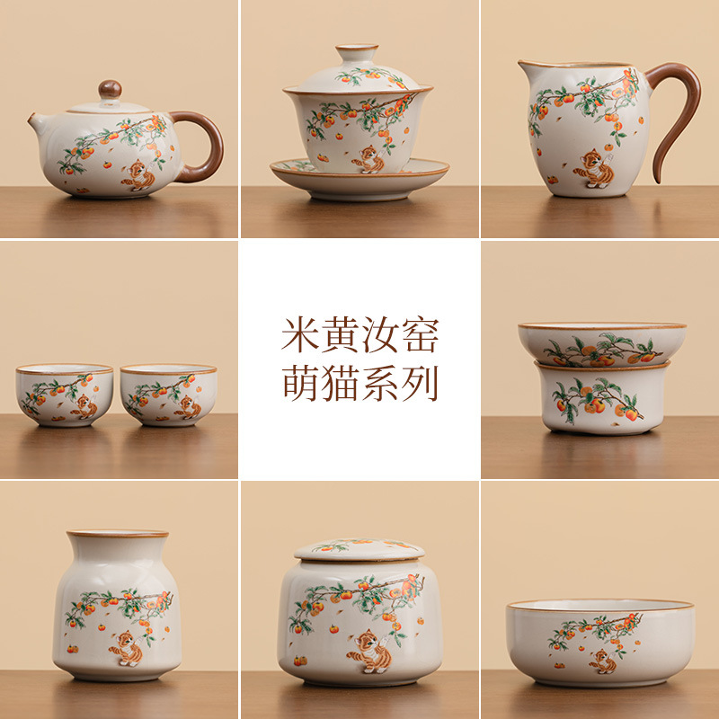 米黄汝窯急須シングル蓋碗陶磁器家庭用手掴み壺カンフー茶器開片可養トランペット茶器