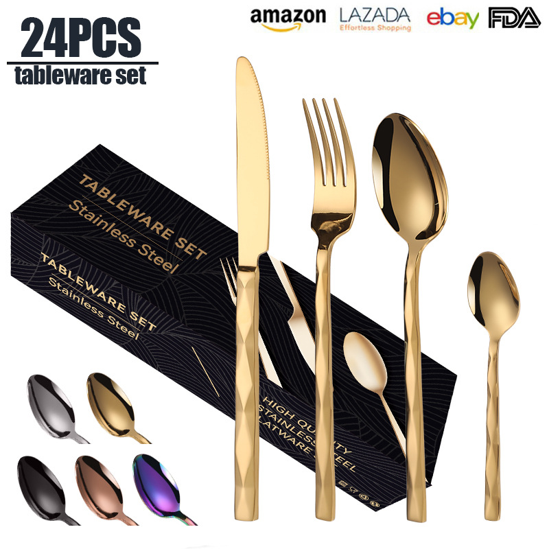 跨境亚马逊不锈钢刀叉勺高端西餐具酒店餐厅菱形牛排刀叉24件套装
