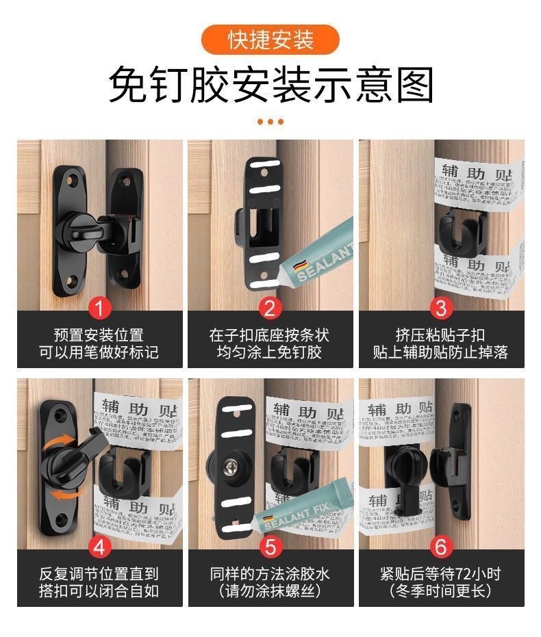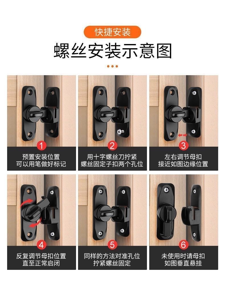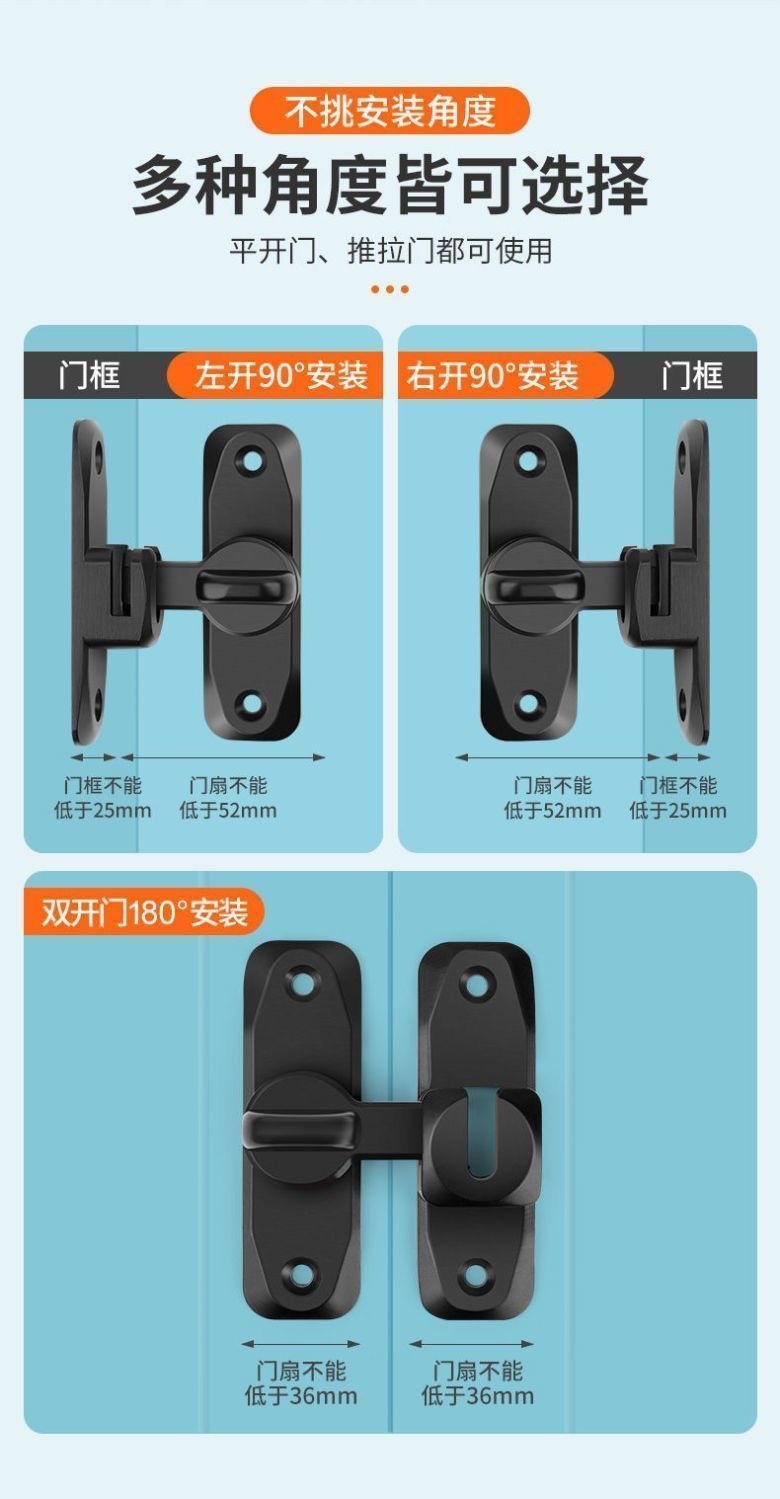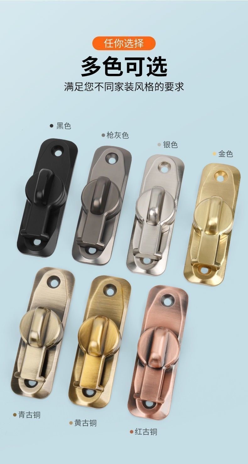 アルミ合金製ソリッドドアロック 家庭用90度180度盗難防止バックル 浴室用穴あけ不要プラグロック 厚型ロック