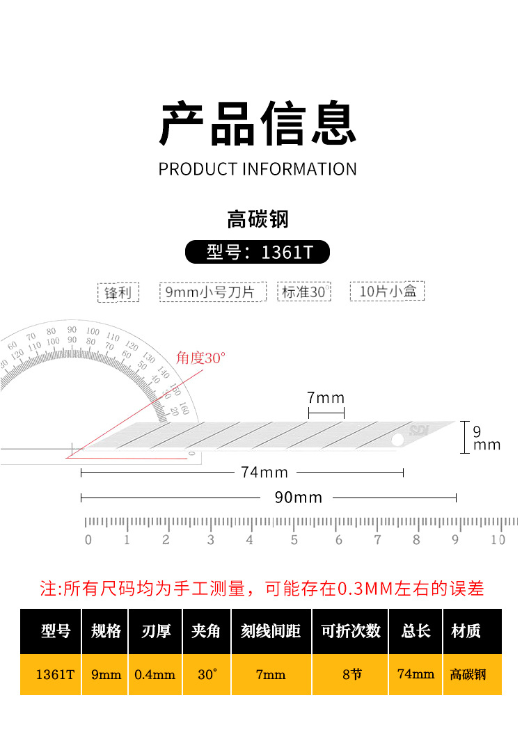 台湾SDI手牌美工片1361.进口高碳钢9mm合金钢刀片30°小号美工刀