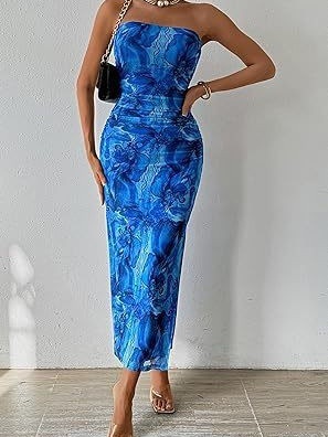 2025 ヨーロッパとアメリカの新しいクロスボーダー婦人服 AliExpress shein チューブトップ裾スリットノースリーブプリントドレス