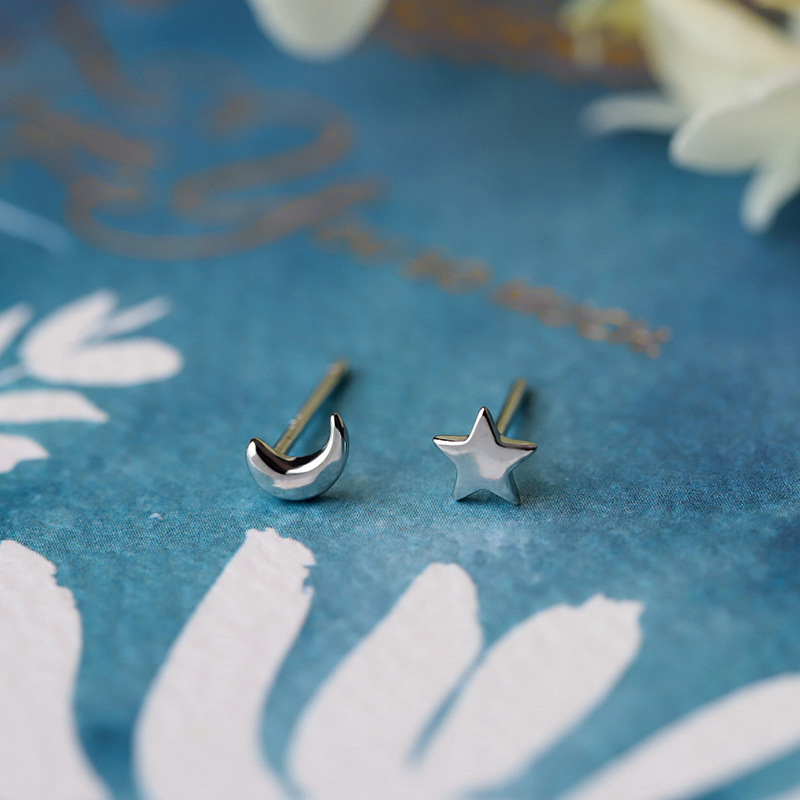 純銀星月ピアス女性非対称五角星耳釘冷淡風シンプル耳飾り耳銀飾り