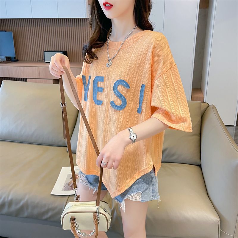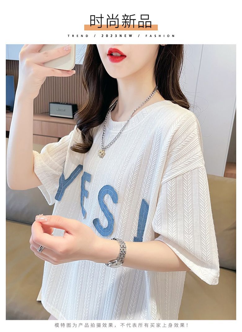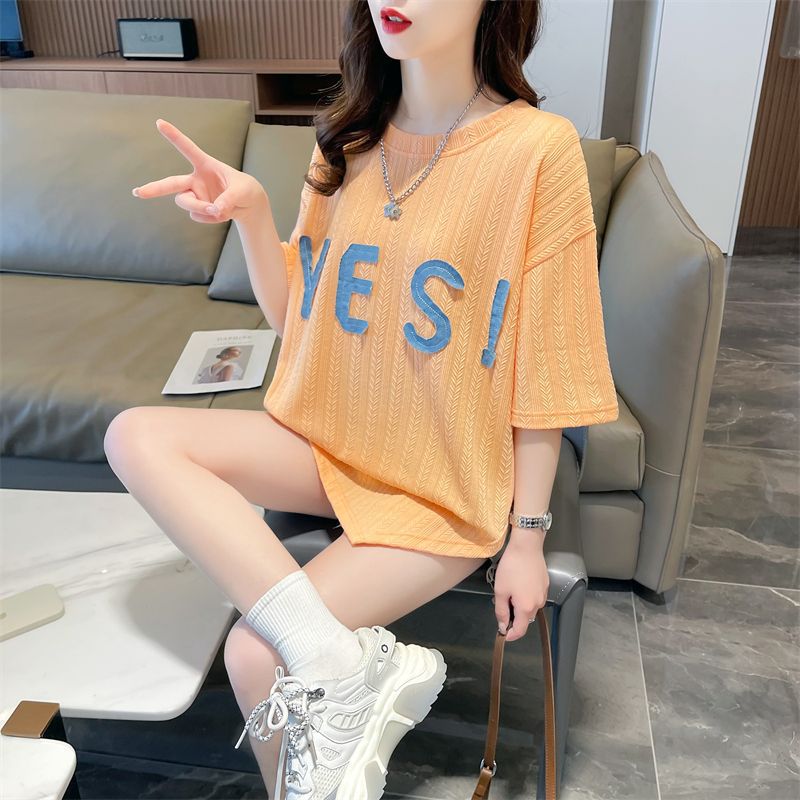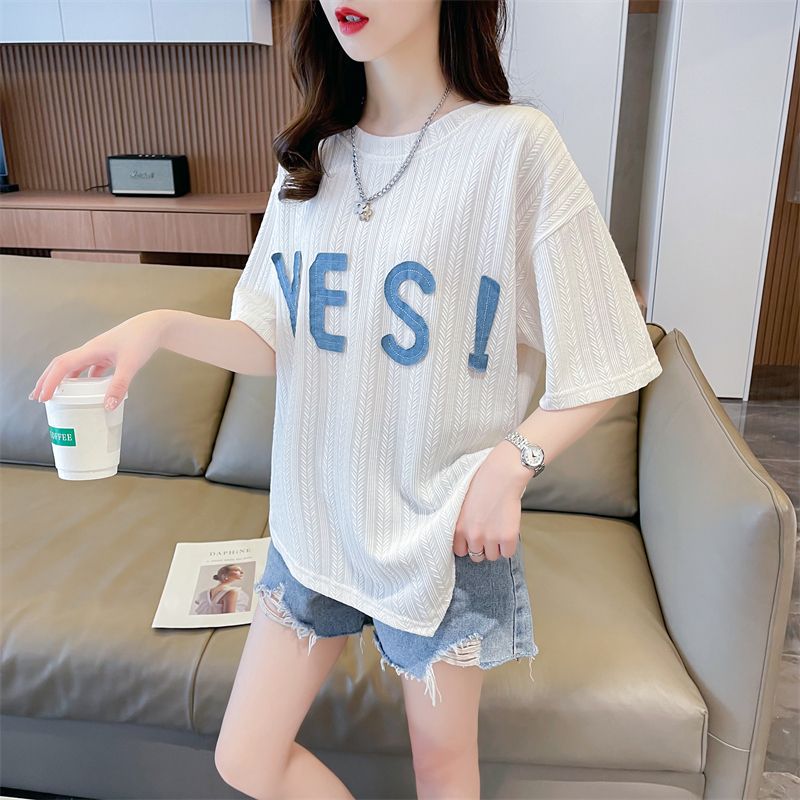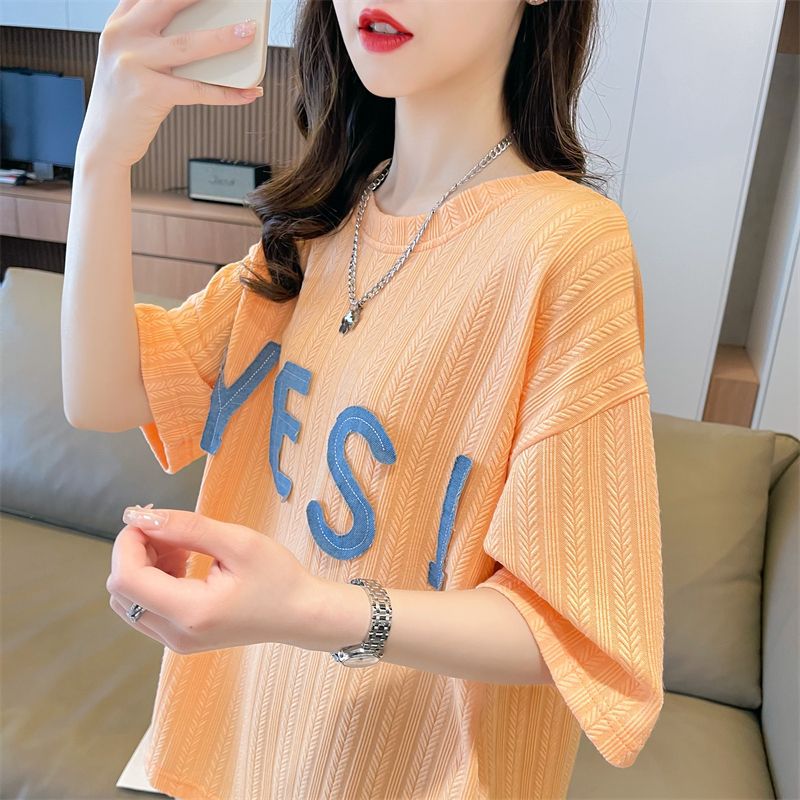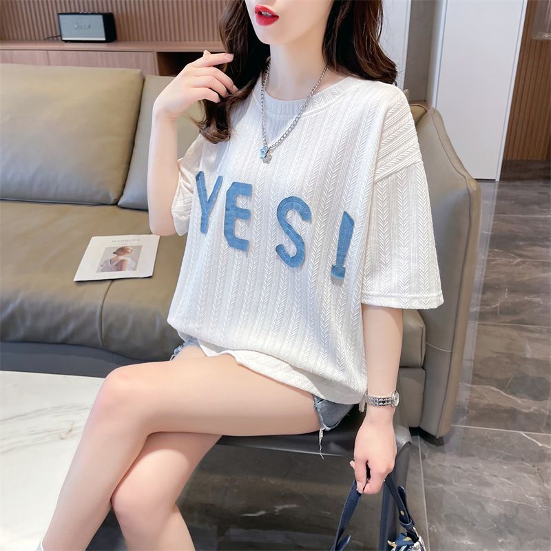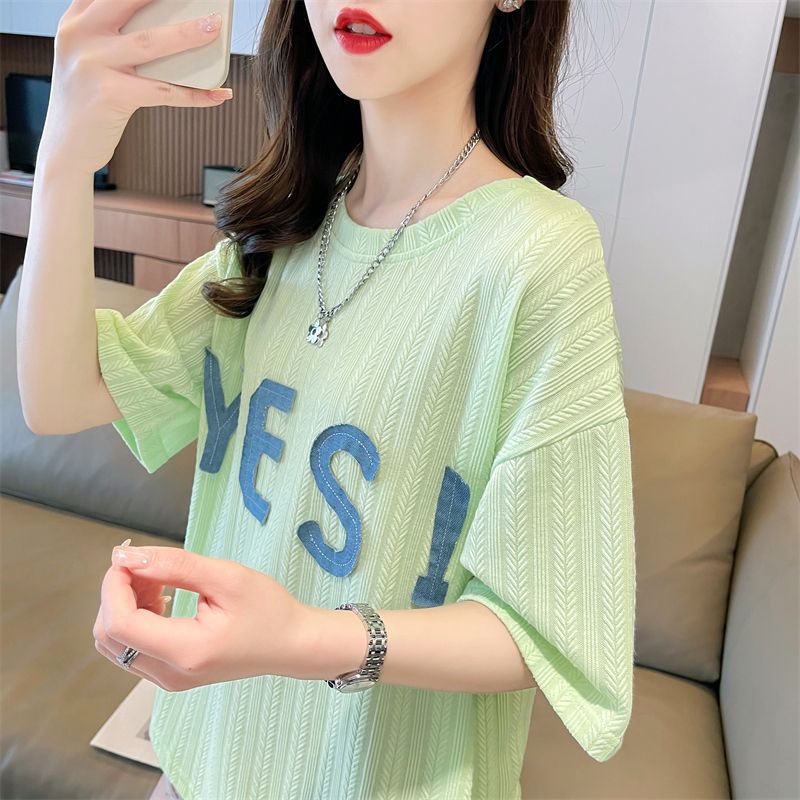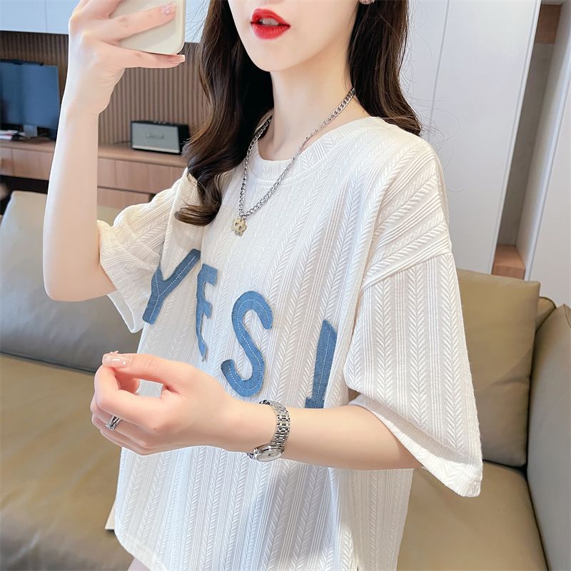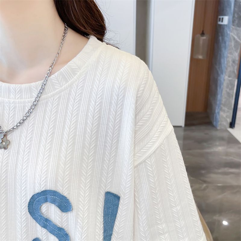デニムtシャツレディース半袖ゆるいデザイン感アルファベットジャカード高級感インスタ夏の薄いラウンドネックトップスレディースファッション