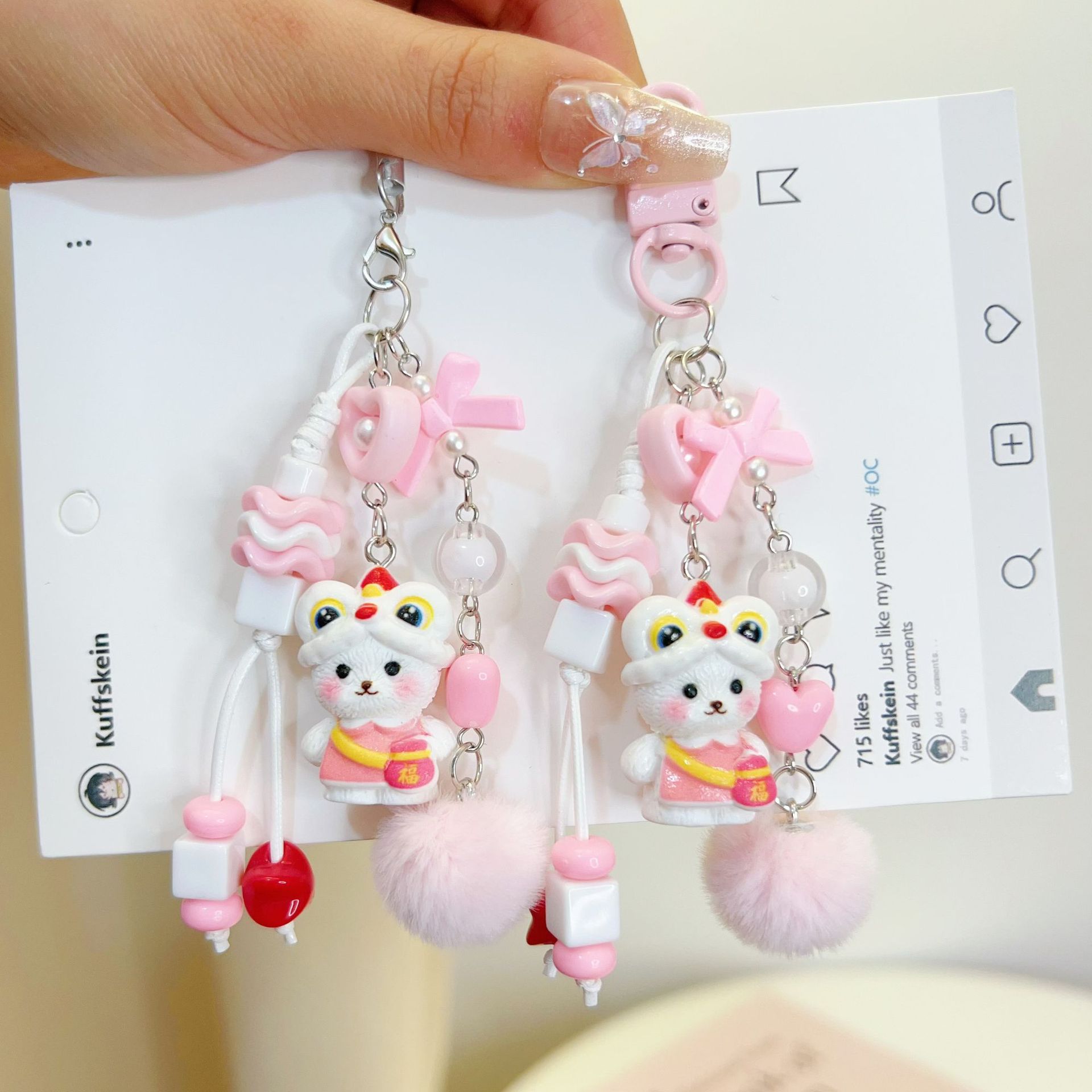 原创新款醒狮小熊串珠手机链可爱粉色爱心钥匙扣公仔包包挂件批发