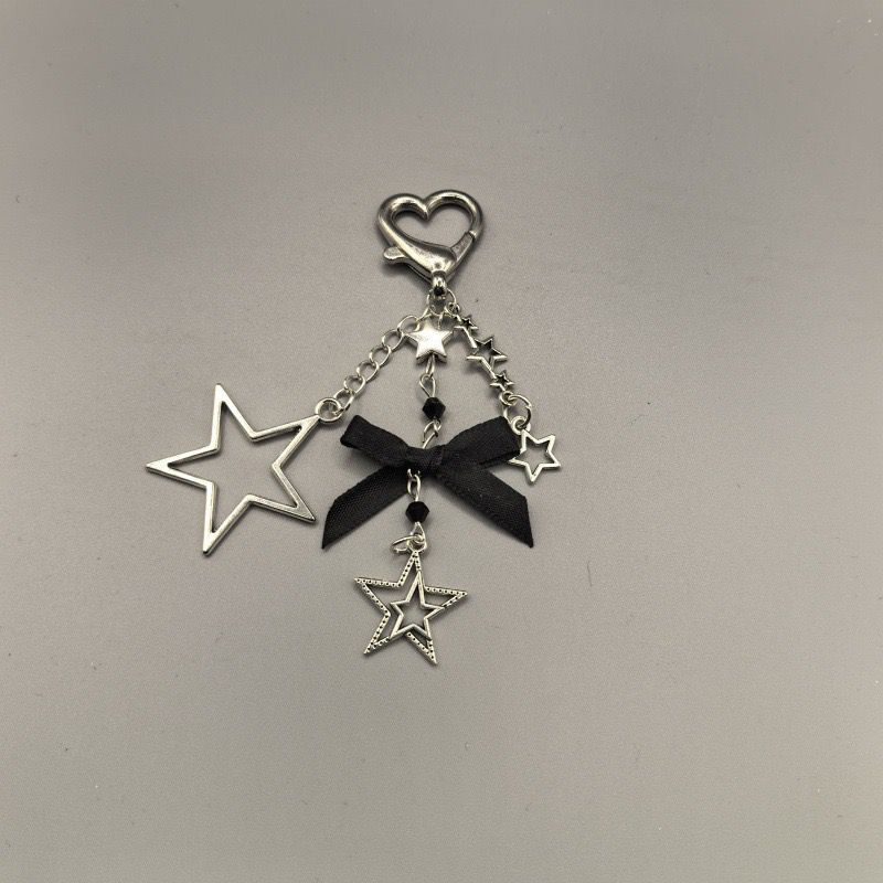 【大きな星の黒い蝶結び】銀色の質感の携帯チェーンのキーホルダー