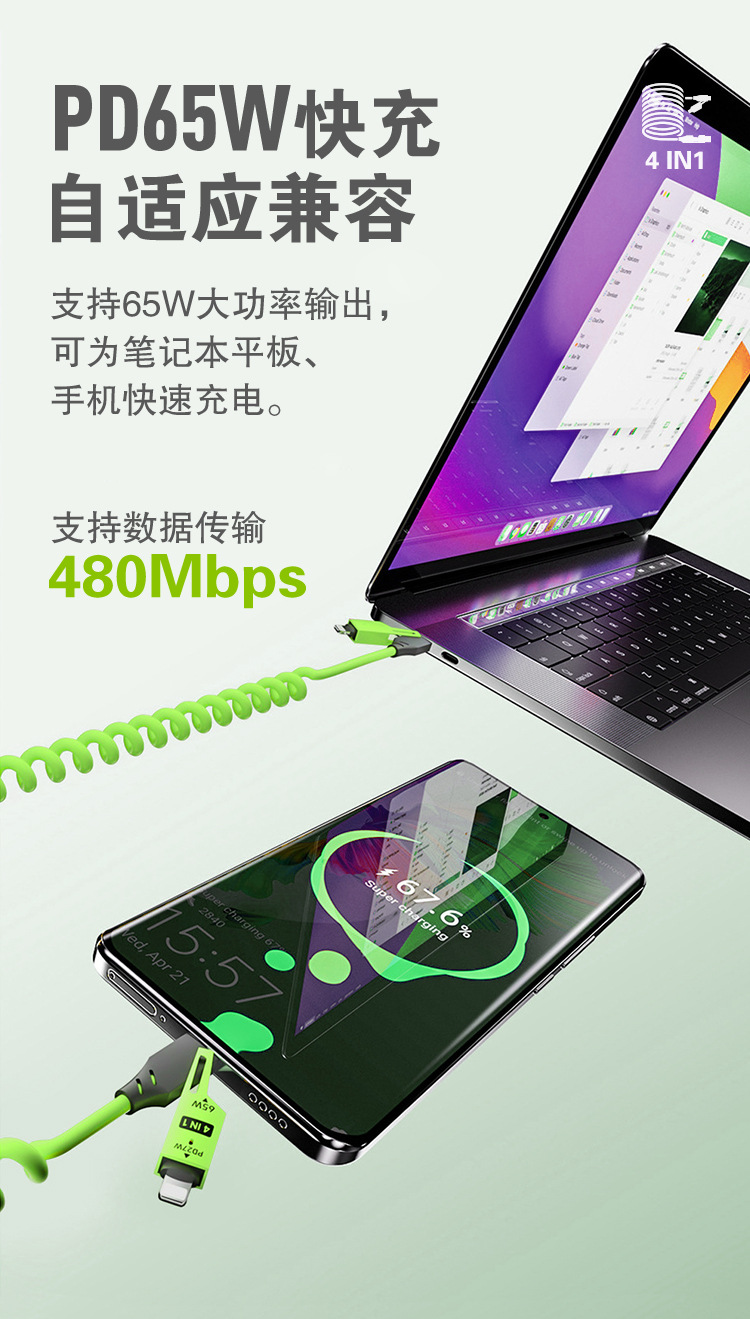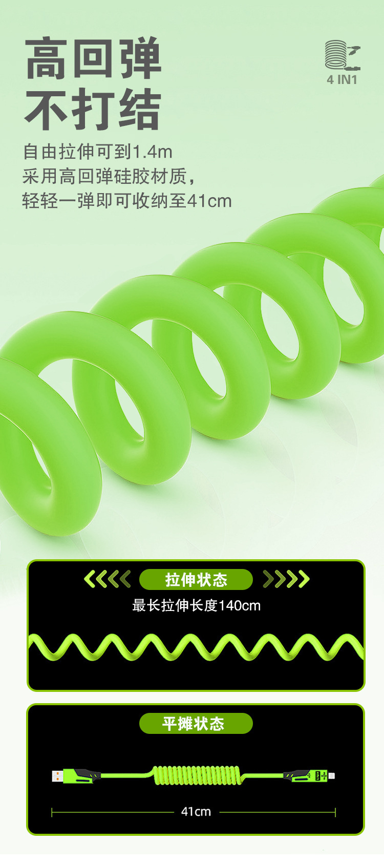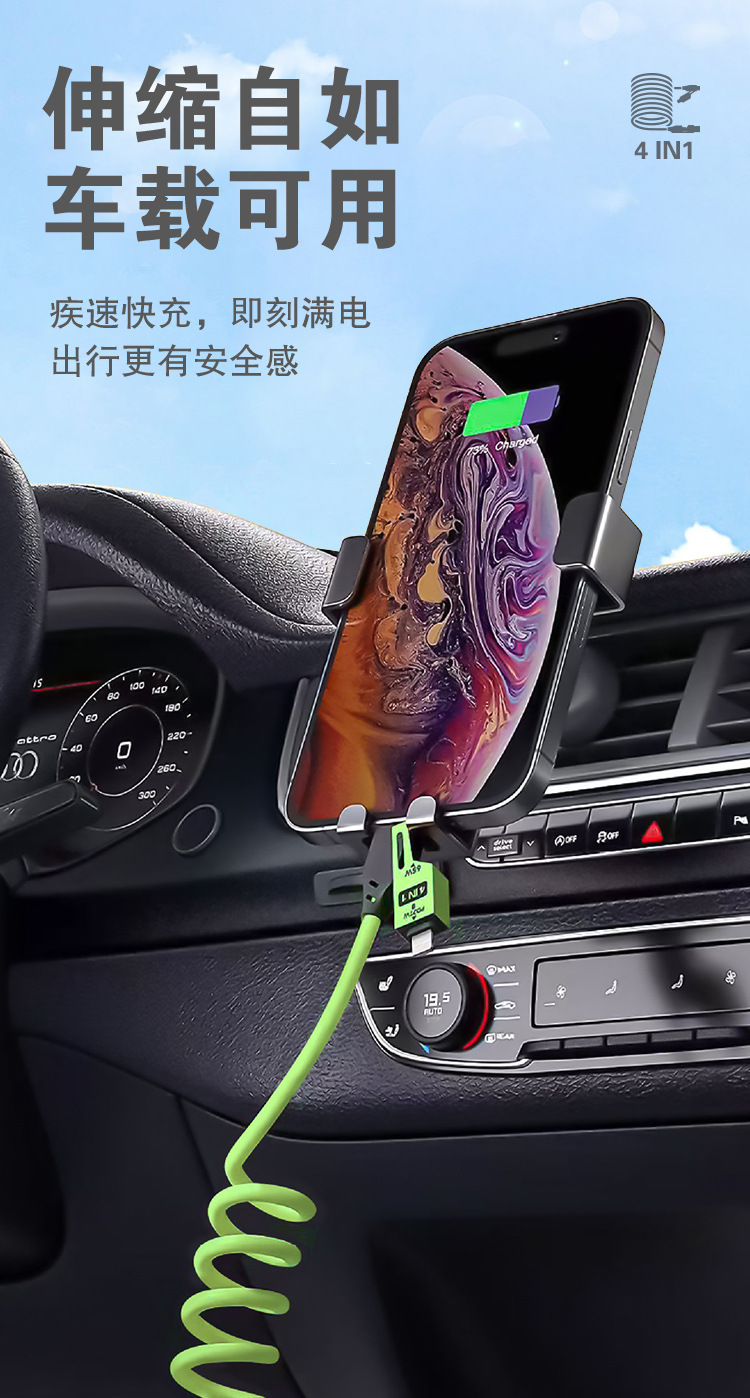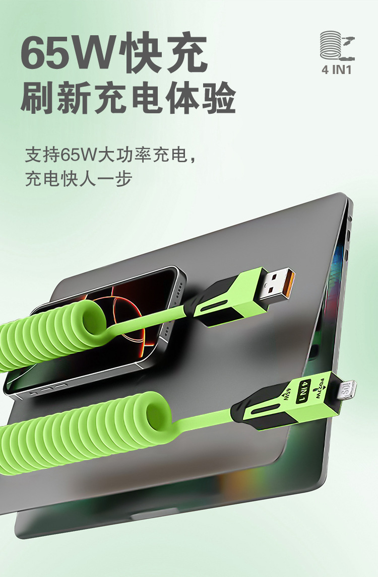 弹簧适用65W四合一快充数据线typec车载伸缩华为苹果安卓充电线