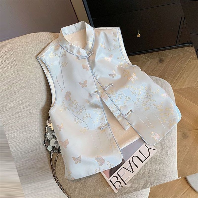 2025年の春の新型の新中国式のバックルの肩の上着の国風の馬の甲の婦人服の馬のベストの百合の袖なし
