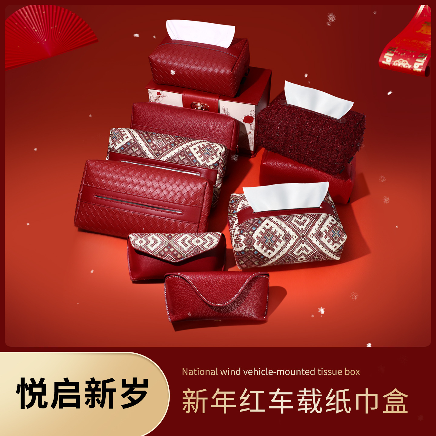 车载纸巾盒新年红轻奢高级感抽纸盒本命年皮质收纳结婚喜庆抽纸盒