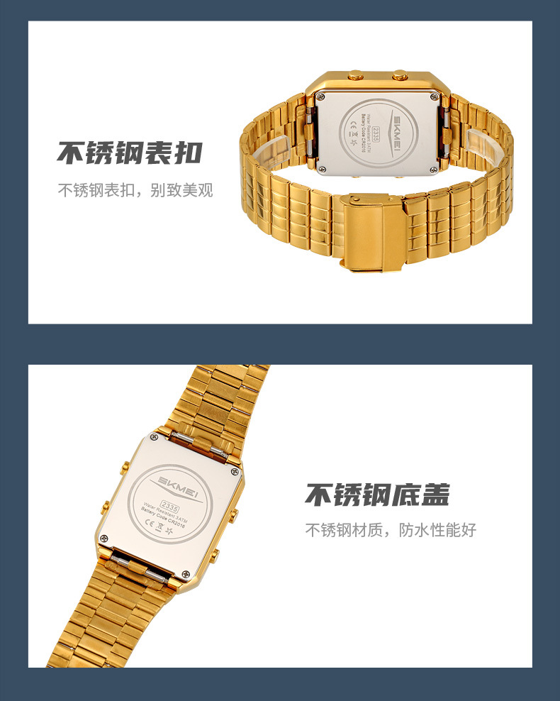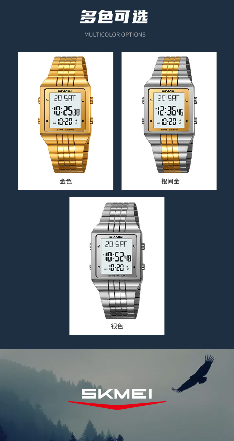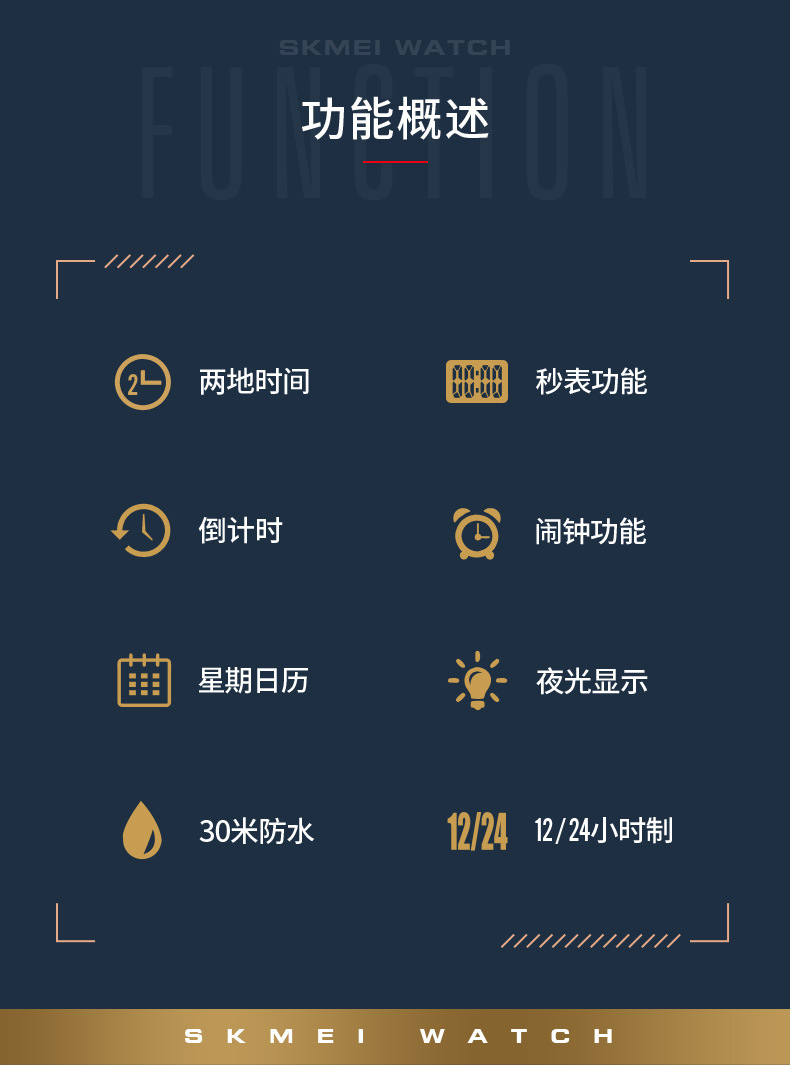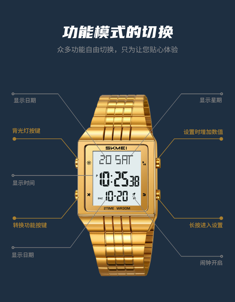 功能:两地时间、秒表计时、日期、定时响闹、星期、EL夜光、整点报时、12/24小时制、倒计时。